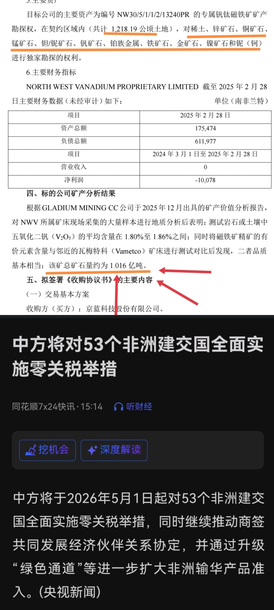 $ST京蓝(SZ000711)$ 堪称炸裂。。京蓝12月买下的非洲南非矿场全是稀有金属:包含金矿,铜矿,钒矿,稀土在内的总矿石储量高达惊人的1.016亿吨。央视刚刚宣布这些矿运到中国全部0关税!!
