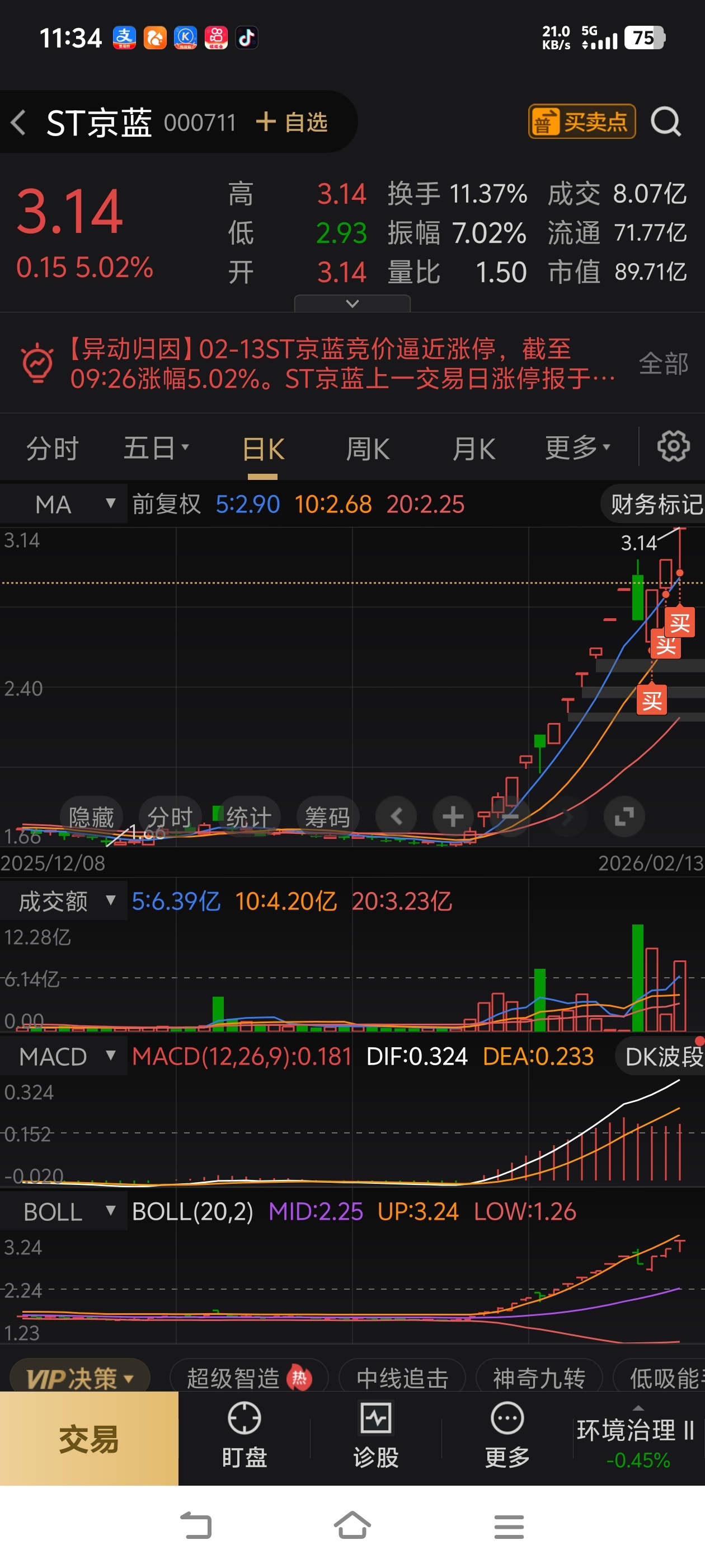 $ST京蓝(SZ000711)$ 够个鸟,才买进了210手,节后我又有资金了,不知道还能不能买进去