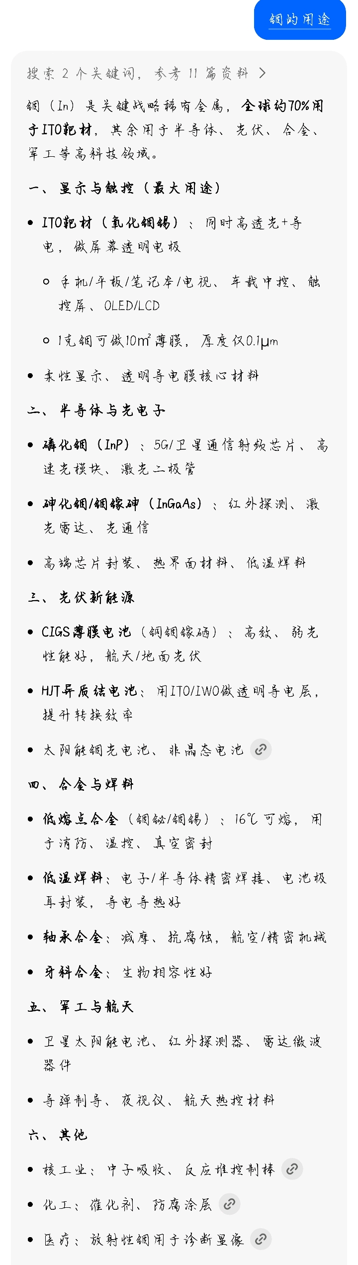 机器人,航天卫星,太空光伏。半导体,电池等等。都别想离开铟!抢资源的时代来了。小金属疯狂涨价!