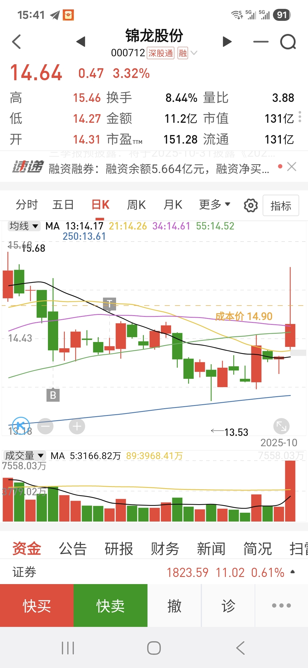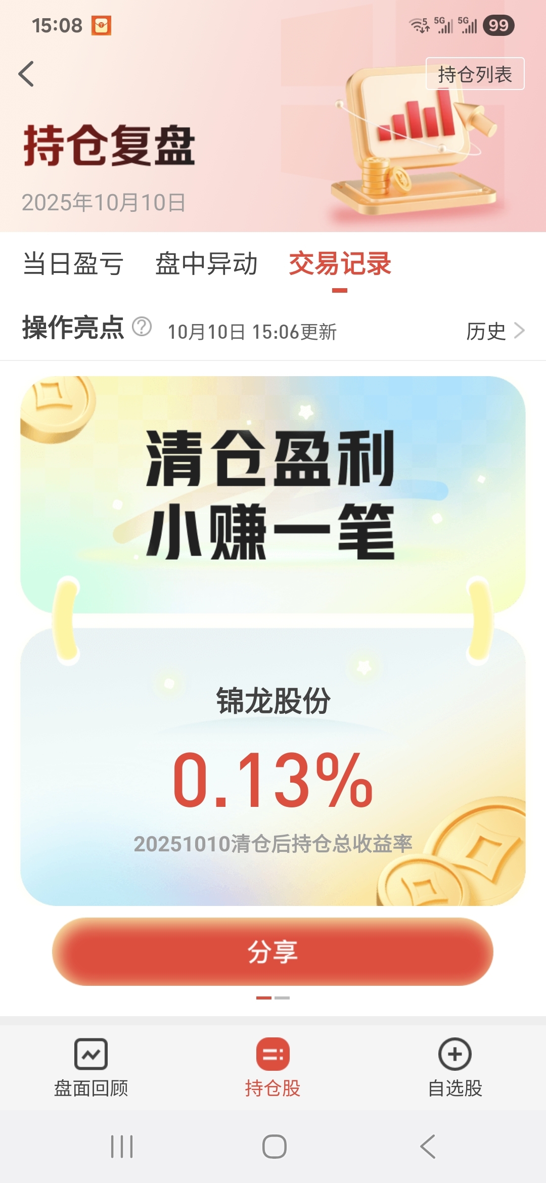 上个月3号买的,当天套6个点,最高套10个点,今天终于解套,谢谢旺财们
