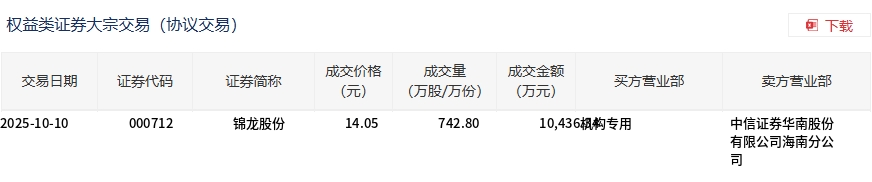 锦龙股份今日大宗交易折价成交742.8万股,成交额1.04亿元
