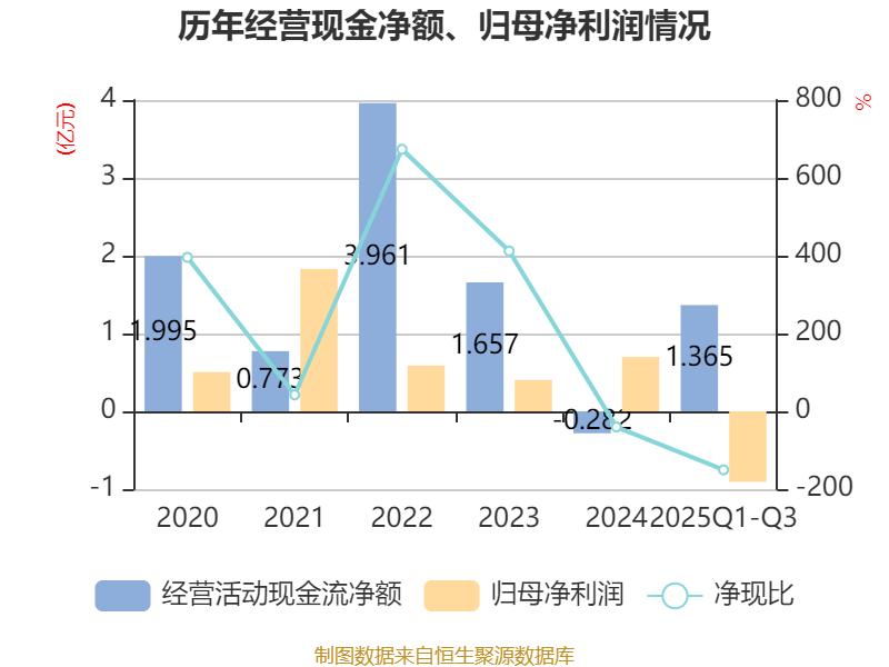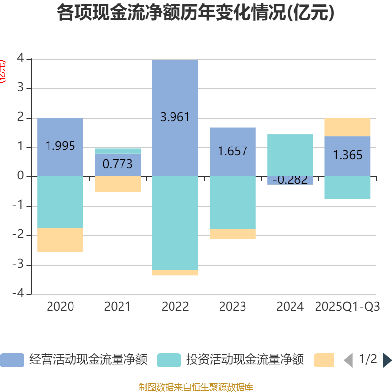2025年前三季度,公司经营活动现金流净额为1.36亿元,同比增加2.5亿元;筹资活动现金流净额6196.67万元,同比增加4192.21万元;投资活动现金流净额-7806.29万元,上年同期为4748.43万元。
