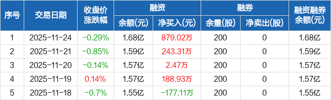 融资方面,当日融资买入1907.14万元,融资偿还1028.12万元,融资净买入879.02万元,连续4日净买入累计1313.73万元。融券方面,融券卖出0股,融券偿还0股,融券余量200股,融券余额1394元。融资融券余额合计1.68亿元。