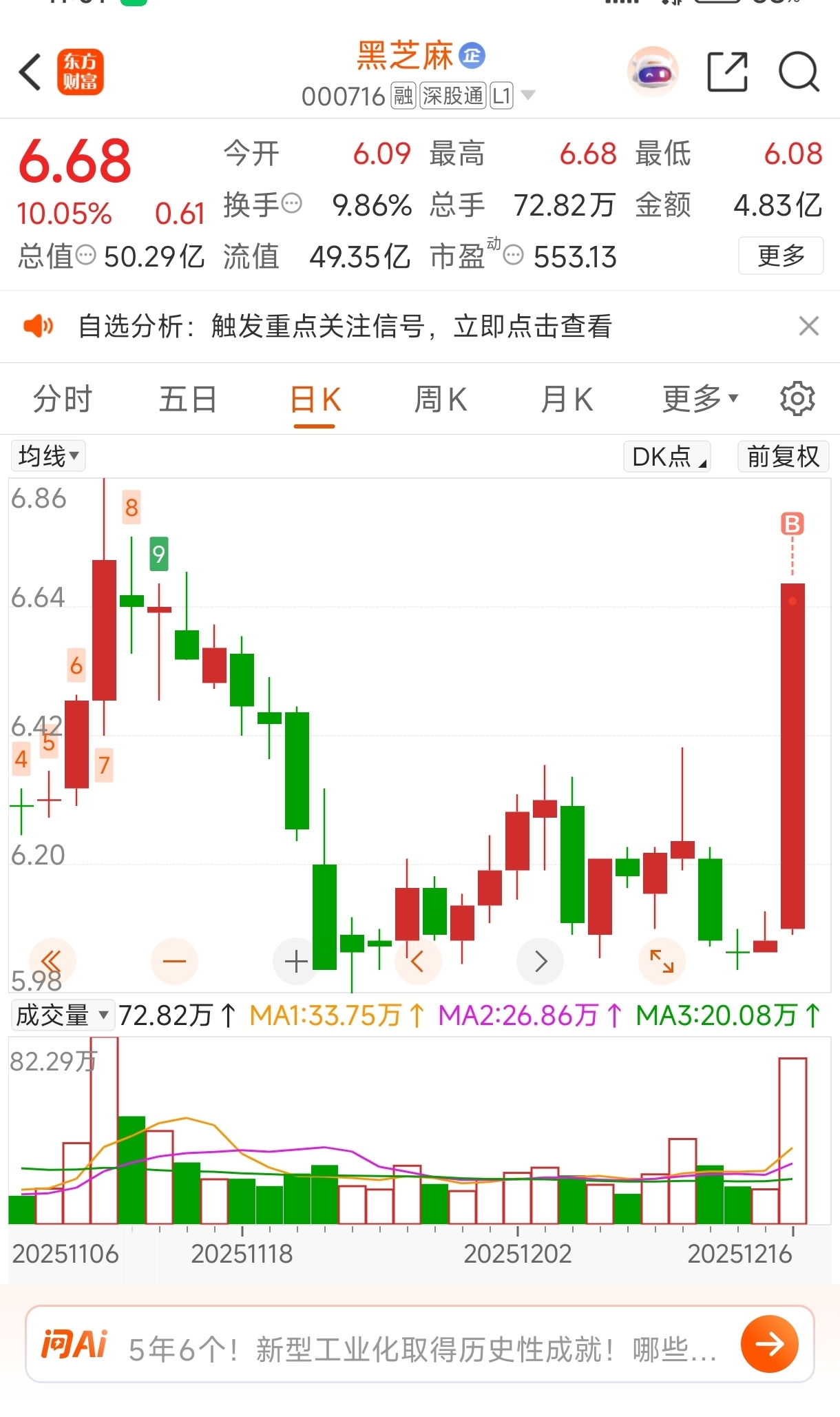 $黑芝麻(SZ000716)$ 低位首板,干就完事了