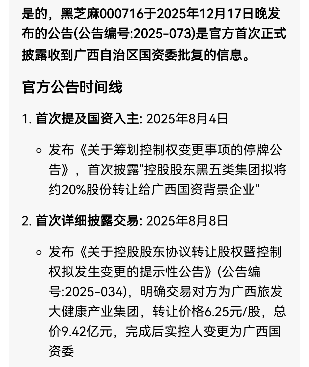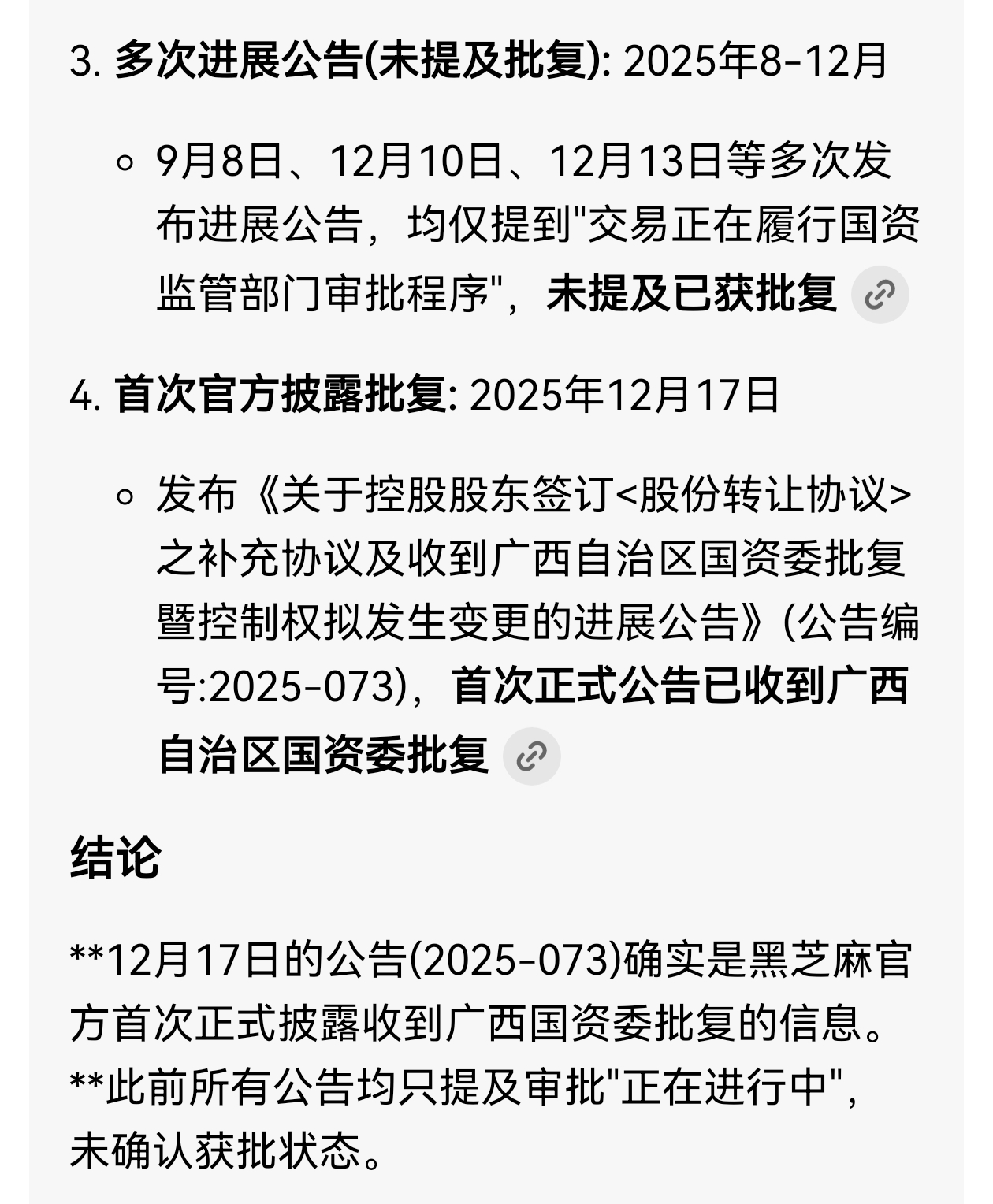 注意:12月17日晚黑芝麻官方公告,是首次发布获得广西国资委批复入主黑芝麻一事,