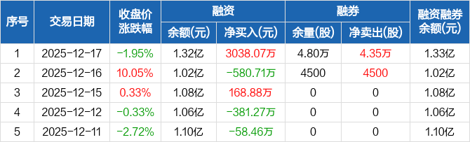 融资方面,当日融资买入6243.44万元,融资偿还3205.37万元,融资净买入3038.07万元,净买入额创12个月新高。融券方面,融券卖出4.35万股,融券偿还0股,融券余量4.8万股,融券余额31.44万元。融资融券余额合计1.33亿元。