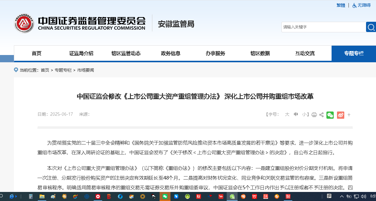 中国证监会支持《上市公司重大资产重组管理办法》深化上市公司并购重组市场改革