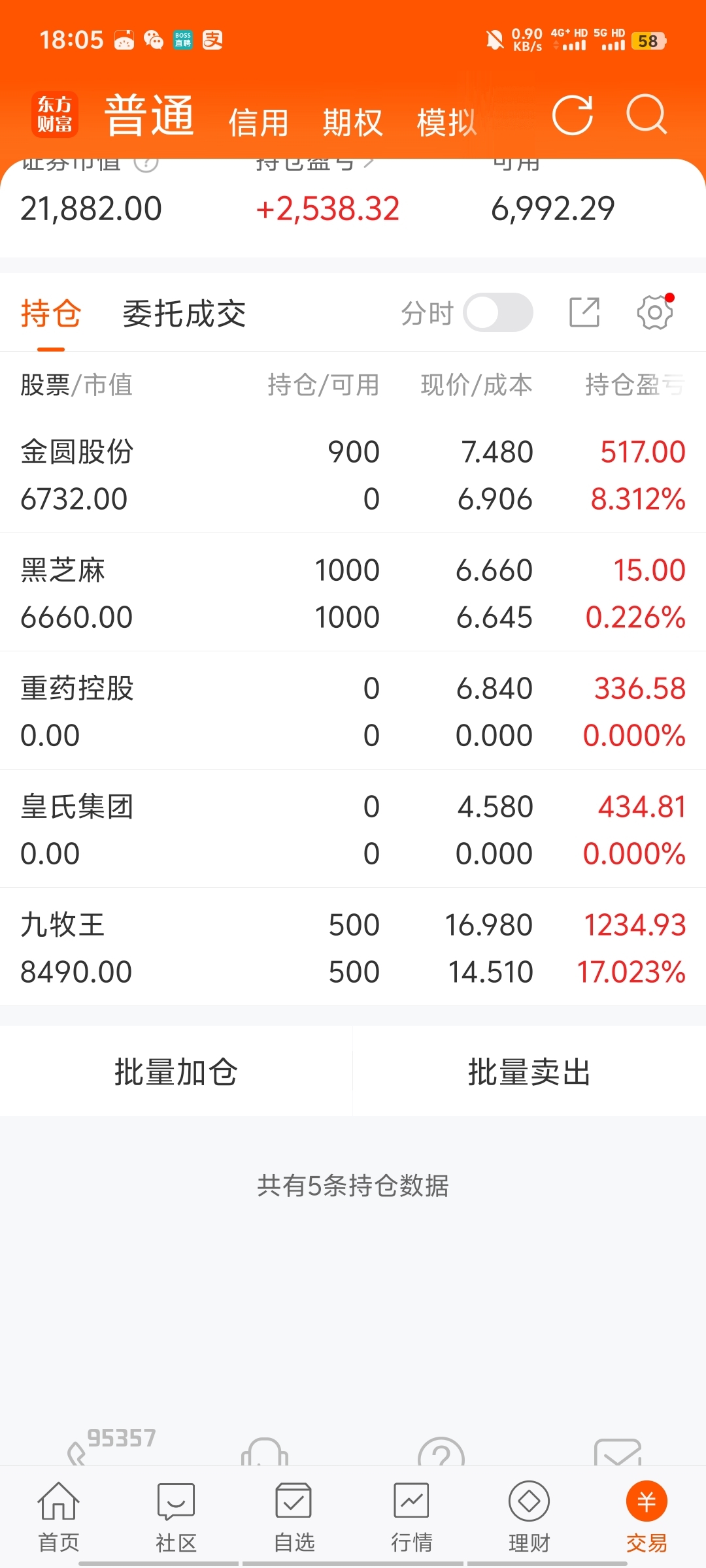 $黑芝麻(SZ000716)$ $九牧王(SH601566)$ $金圆股份(SZ000546)$ 好消息昨天三个涨停有一个晋级成功连板了,今天进的金园也涨停了,坏消息金圆尾盘竞价涨停第一次遇到莫名其妙