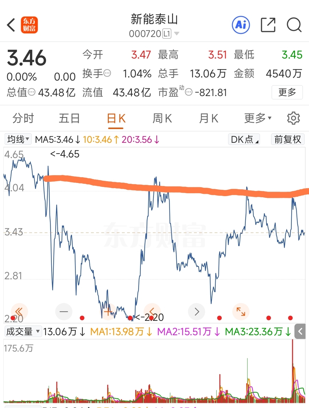 $新能泰山(SZ000720)$ 看月线!在看量!4元左右就是鬼门关!想突破4元以上稳步上升就看阎王爷?!