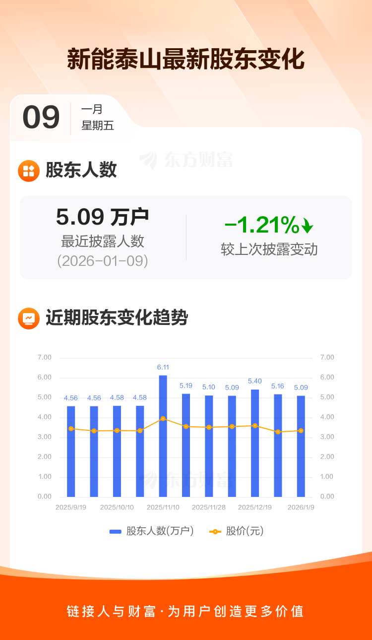 新能泰山:截至1月9日最新股东户数5.09万户,较上期减少1.21%