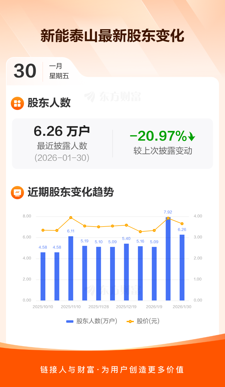 新能泰山:截至1月30日最新股东户数6.26万户,较上期减少20.97%