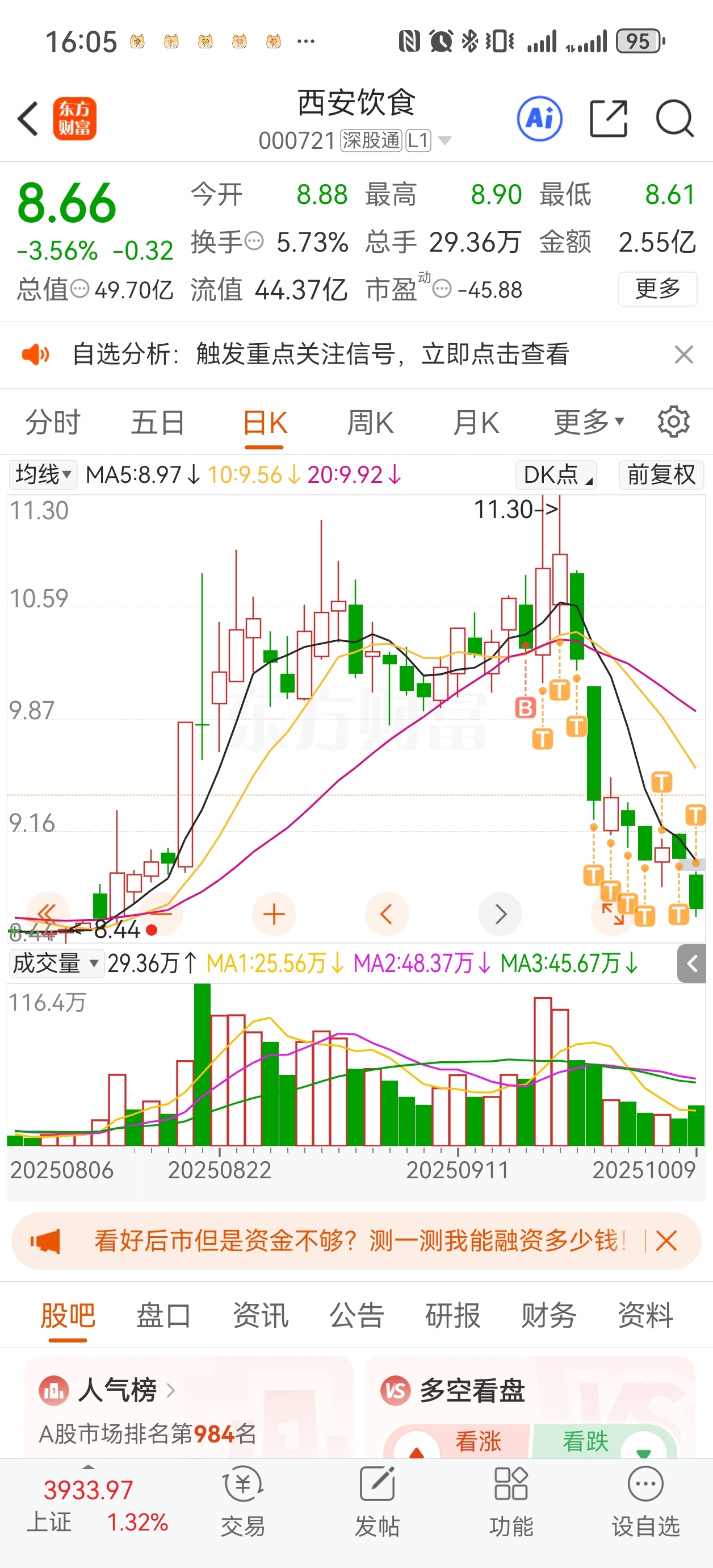 $西安饮食(SZ000721)$ 和庄家一起做了个T