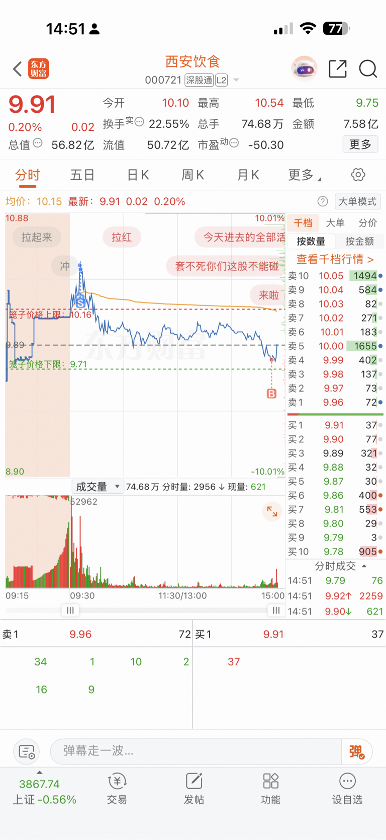 $西安饮食(SZ000721)$ 接一半回来,这行情,不亏就是赚