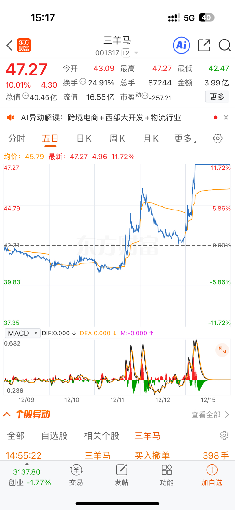 跟三羊马昨天的k线一样,区别就是三羊马没有高开这么多。尾盘跳水我个人认为比尾盘拉