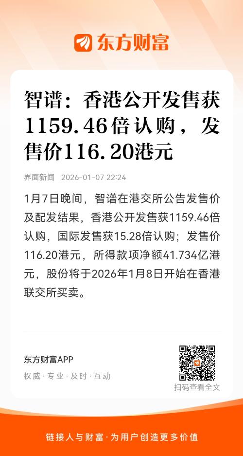 1月7日晚间,智谱在港交所公告发售价及配发结果,香港公开发售获1159.46倍认购,国际发售获15.28倍认购;发售价116.20港元,所得款项净额41.734亿港元,股份将于2026年1月8日开始在香港联交所买卖。