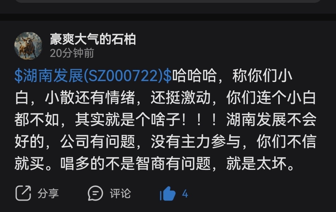 $湖南发展(SZ000722)$ 此人是我大哥,也是北京的,我知道他是托,不要信他的!