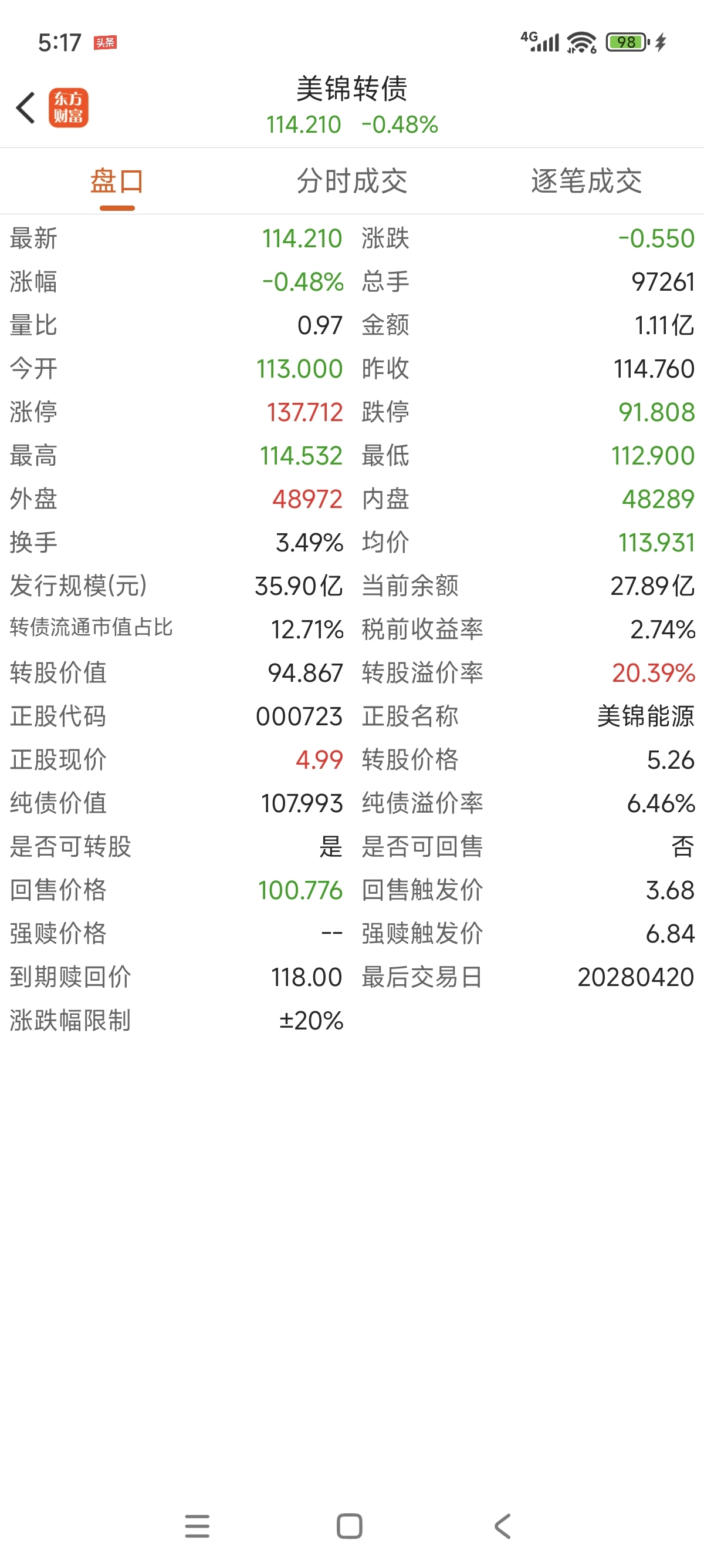 $美锦能源(SZ000723)$ 是不是怕涨起来超过5.26然后27亿可转债都来转股,然后总股稀释加正股上涨都盈利抛售。所以不敢涨啊一直压着。
