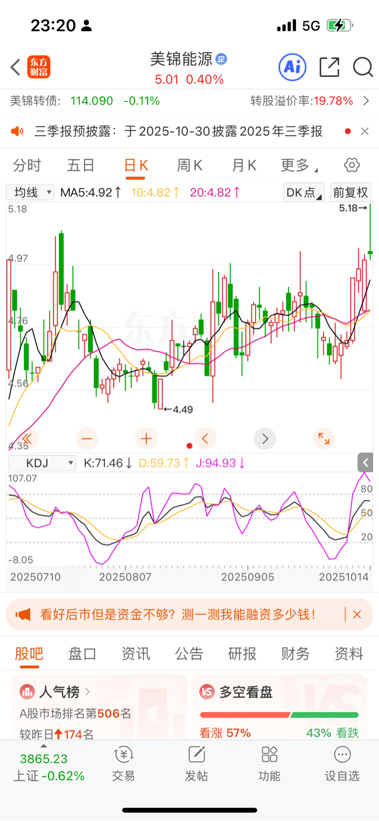 $美锦能源(SZ000723)$ KDJ走势如何,大家也知道明天是什么个走势,绿的概率很大。5元有一个小支撑,如果明天不跌破,后续大概率会继续走一波红的。拭目以待!