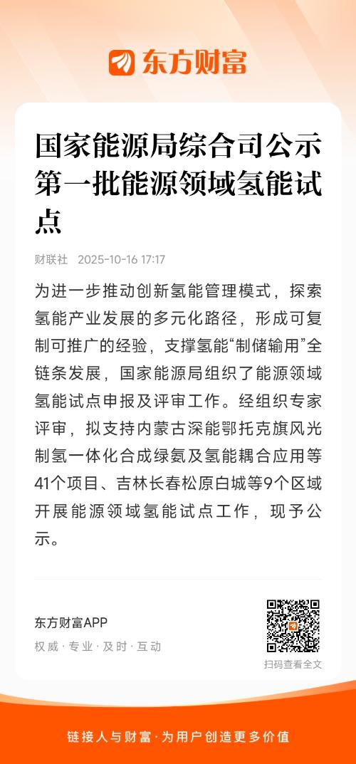 为进一步推动创新氢能管理模式,探索氢能产业发展的多元化路径,形成可复制可推广的经验,支撑氢能“制储输用”全链条发展,国家能源局组织了能源领域氢能试点申报及评审工作。经组织专家评审,拟支持内蒙古深能鄂托克旗风光制氢一体化合成绿氨及氢能耦合应用等41个项目、吉林长春松原白城等9个区域开展能源领域氢能试点工作,现予公示。