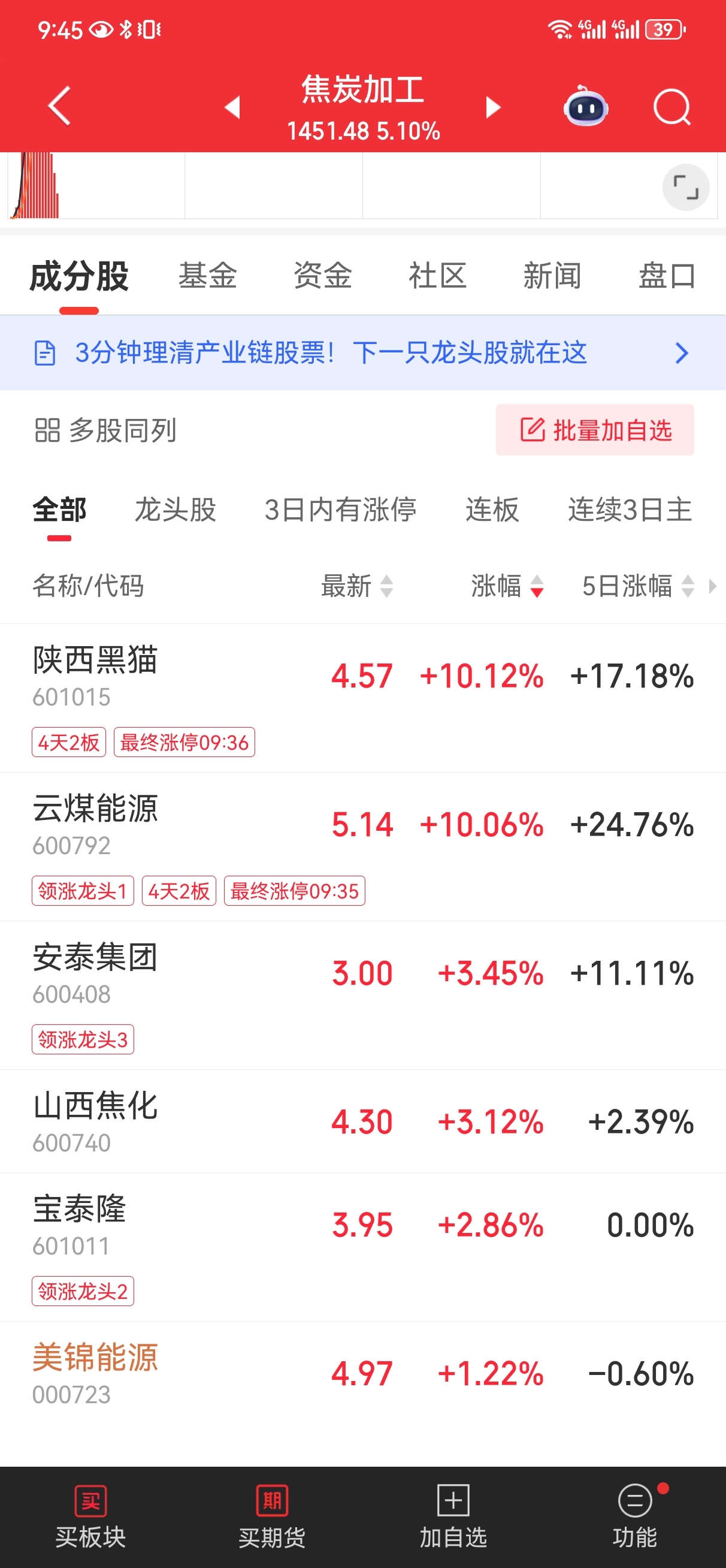 $美锦能源(SZ000723)$ 今天继续倒数第一,云煤股价已经超了阿垃美锦