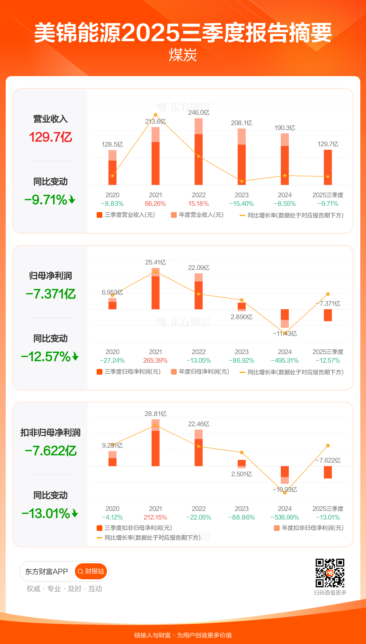 美锦能源10月30日发布2025年三季报显示,公司前三季实现营业收入129.75亿元,同比下滑9.71%;归母净利润-7.37亿元;扣非归母净利润-7.62亿元。