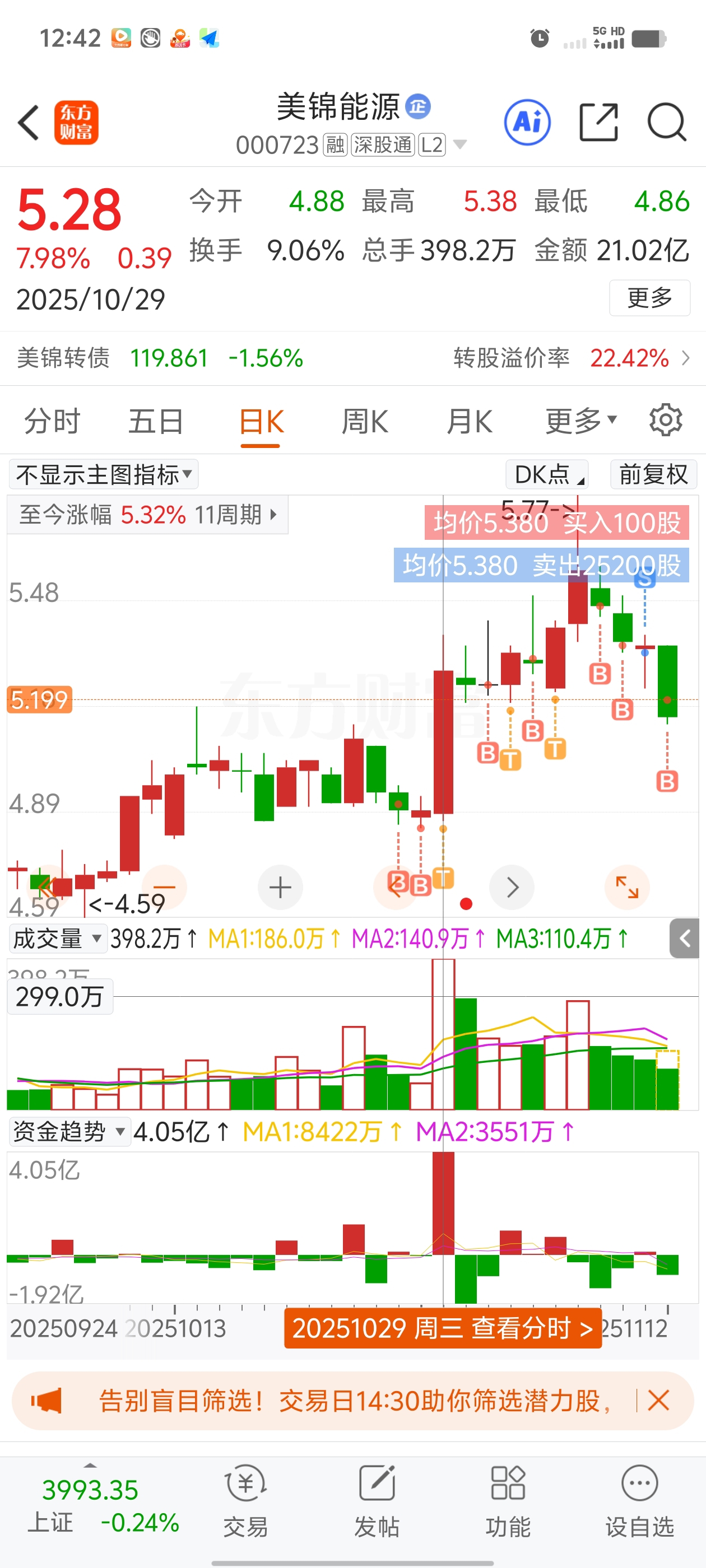 整体来说我还是有9个点的利润,今天挂了5.19元已经是短期低位,看来要5元附近。