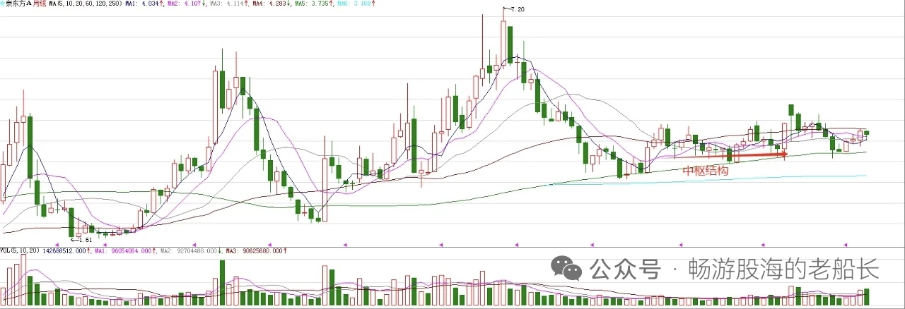 $京东方A(SZ000725)$ 京东方A,月线级别的走势来看,图中标注的中枢结构实现有效突破,意味着股价开启新的比较大的上涨周期。结构突破之后,通常有调整,这只个股也不例外。调整之后,已经开始上涨,到十月份为止,走了三个有效周期,节后就是月线级别的变盘点。所以,节后股价有望开启波段上涨。