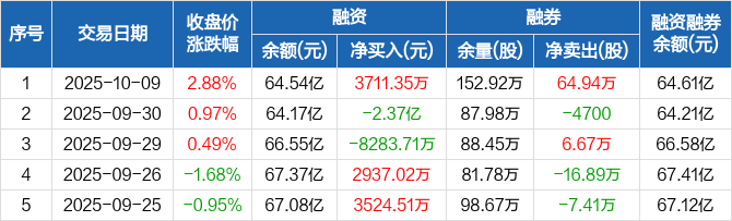 融资方面,当日融资买入7.54亿元,融资偿还7.16亿元,融资净买入3711.35万元。融券方面,融券卖出90.53万股,融券偿还25.59万股,融券余量152.92万股,融券余额654.5万元。融资融券余额合计64.61亿元。