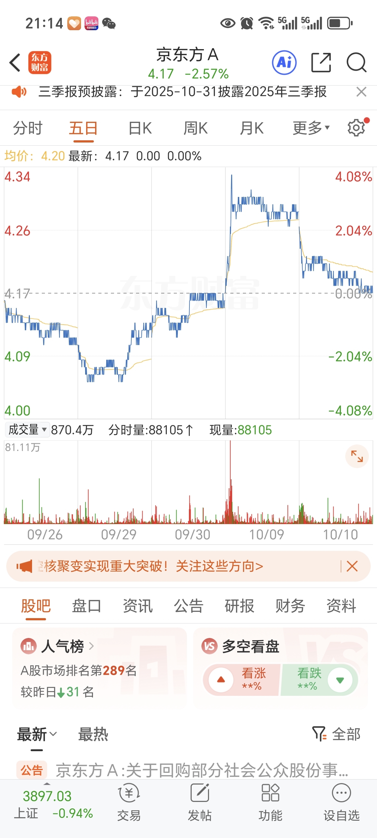 $京东方A(SZ000725)$ 大家看一看,这么稳的操作,一分不差的细节,这不是量化?不得玩死大家,牛市里面忍饥挨饿,馋死我了