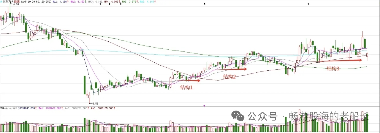 京东方A,今天探底回升,再度回踩了结构3的下轨,调整空间到了。只是短线还有回踩动作,这是结构3突破后的回踩,主要目的是给半年线上行提供更多时间。图中标注的结构1和结构2突破,意味着新的波段上涨不远了。结构3的突破,意味着波段上涨即将开始。短线调整后,波段上涨自然就开始了。
