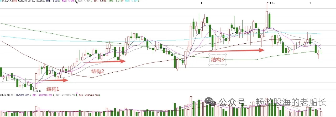图中标注的前两个结构突破,意味着股价处在上涨趋势。结构3是结构2突破后的回踩,意味着波段上涨不远了。