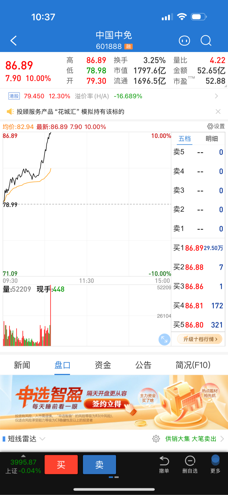 中国中免又涨停。这里还是在字母爹后面吃pi