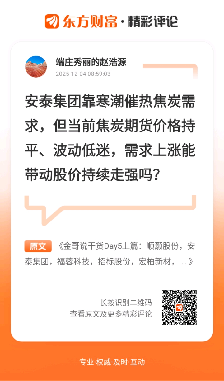 但寒潮是短期催化,得看钢企后续需求。就像骑行遇顺风别耗尽体力,这票可小仓位试错,盯紧焦炭价格走势做判断。$安泰集团(SH600408)$