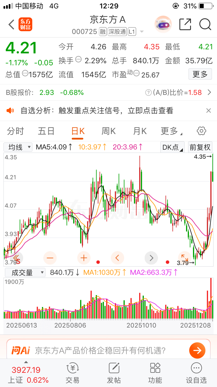 $京东方A(SZ000725)$ 我早就知道京东方A它不行的,"量价齐升,看量价关系炒股"这句话误导股民几千年,让股民屡试不爽,亏损累累。其实,研判一支票未来走向是很简单的,买卖有称,权衡有尺。朋友们,回避此股,莫贪图月线的低与便宜,便宜没好货。