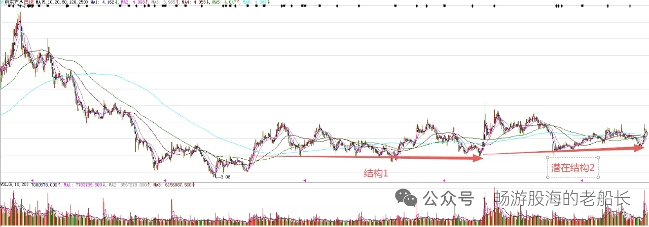 $京东方A(SZ000725)$ 股价回踩了十日均线,探底回升,符合预期。今天,是第十个有效的上涨周期,是变盘节点。股价企稳,是正常的。最近的调整,主要目的是给20、60、120日三条中长期均线上行提供更多时间。下周,股价大概率还会继续上行。图中标注的大型结构1突破,意味着股价处在比较大的上涨趋势。潜在结构2是结构1突破后的回踩,是为了蓄势开启新的波段上涨。目前,波段上涨大概率已经拉开了帷幕。