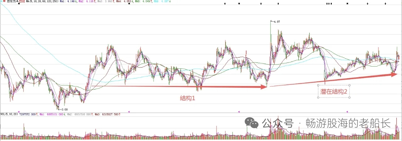 低开高走、冲高回落,走出了比较特殊的K线,既回补了前一个交易日的下影线,又再度释放了企稳信号。周期面来看,上周五是第十个有效周期,是变盘节点。所以,调整大概率要结束了。图中标注的大型结构1突破,意味着股价处在比较大的上涨趋势。潜在结构2,是结构1突破后的回踩,是正常的调整。最近的调整,不过是为了修复三条中长期均线,修复难度不大,所以,波段上涨随时会继续。
