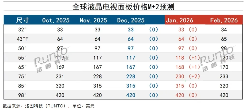 洛图对明年1-2月面板价格预测,2月有望全面提价!