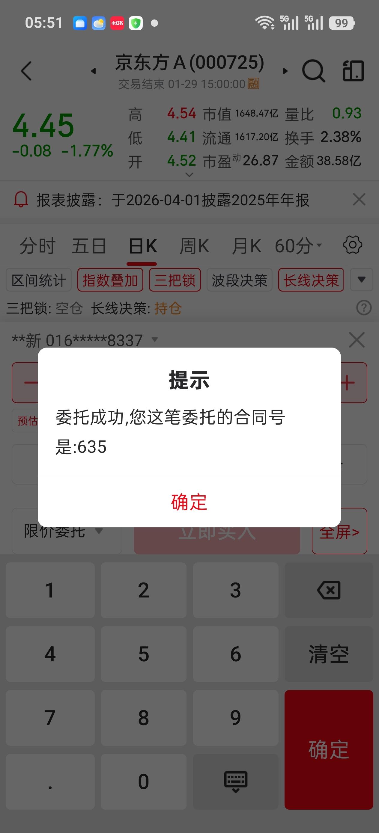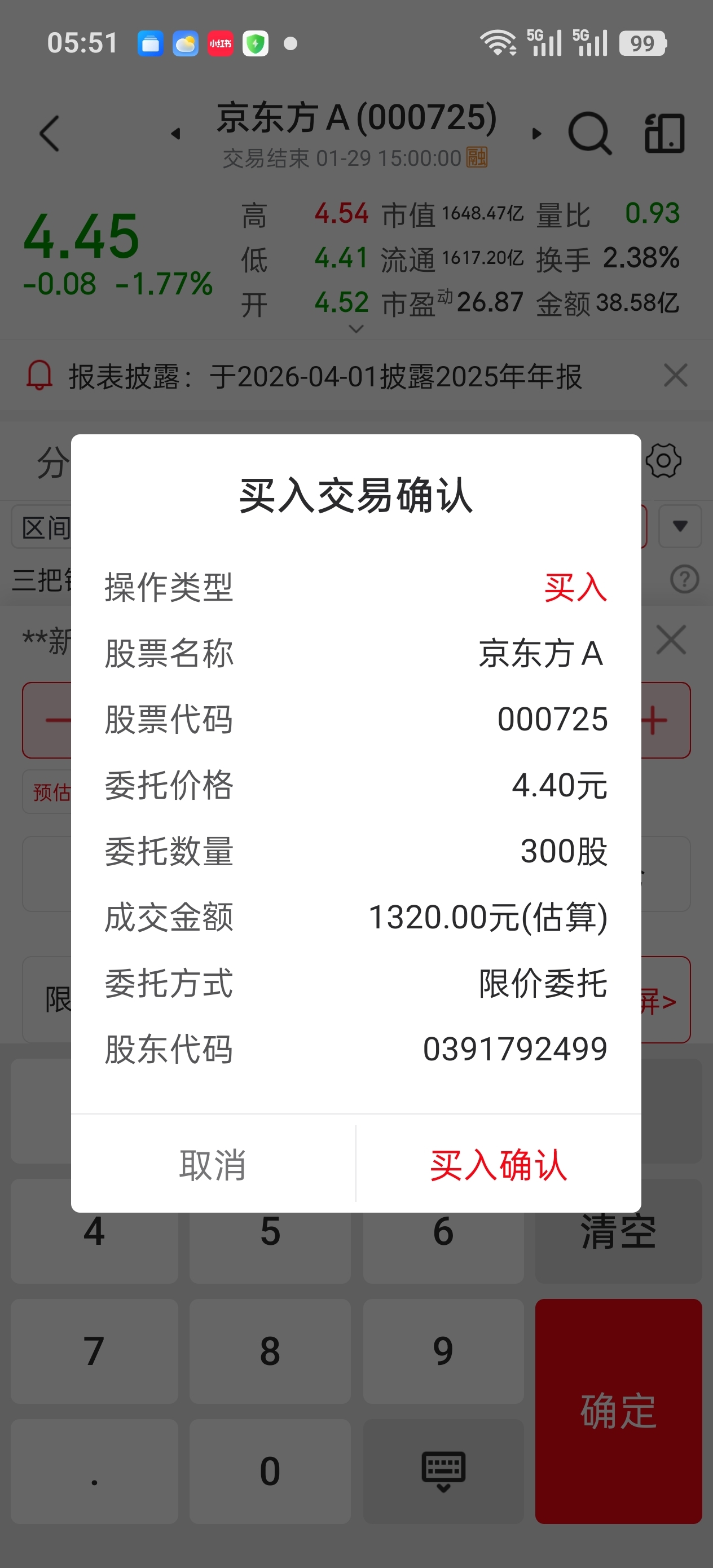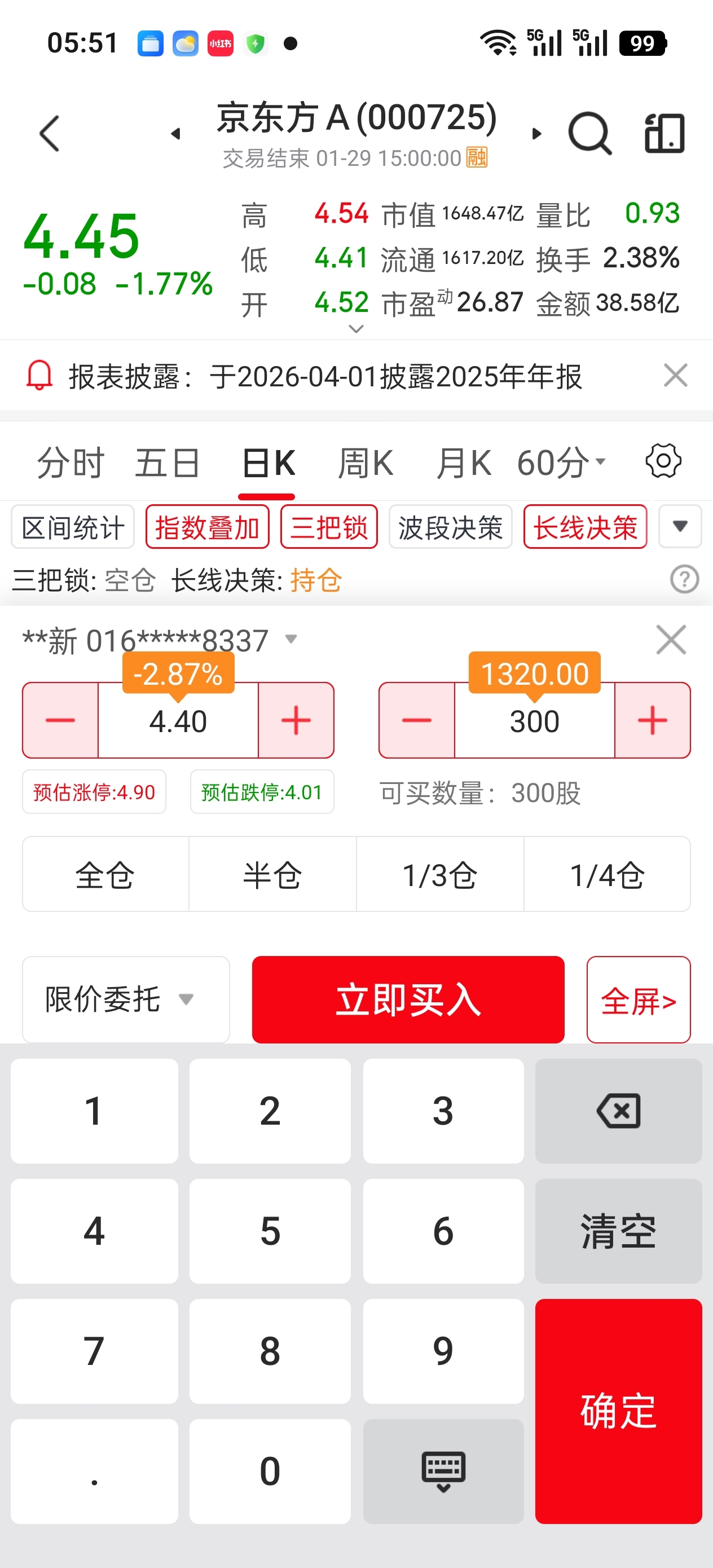 $京东方A(SZ000725)$ 小股民的欢乐豆?昨天小酌一杯,酒醒了,不想空仓,逢低吸纳,如果打4.41元好成交,小股民不少交税,咱再低一分看看,五元每单,买个娱乐为主!!