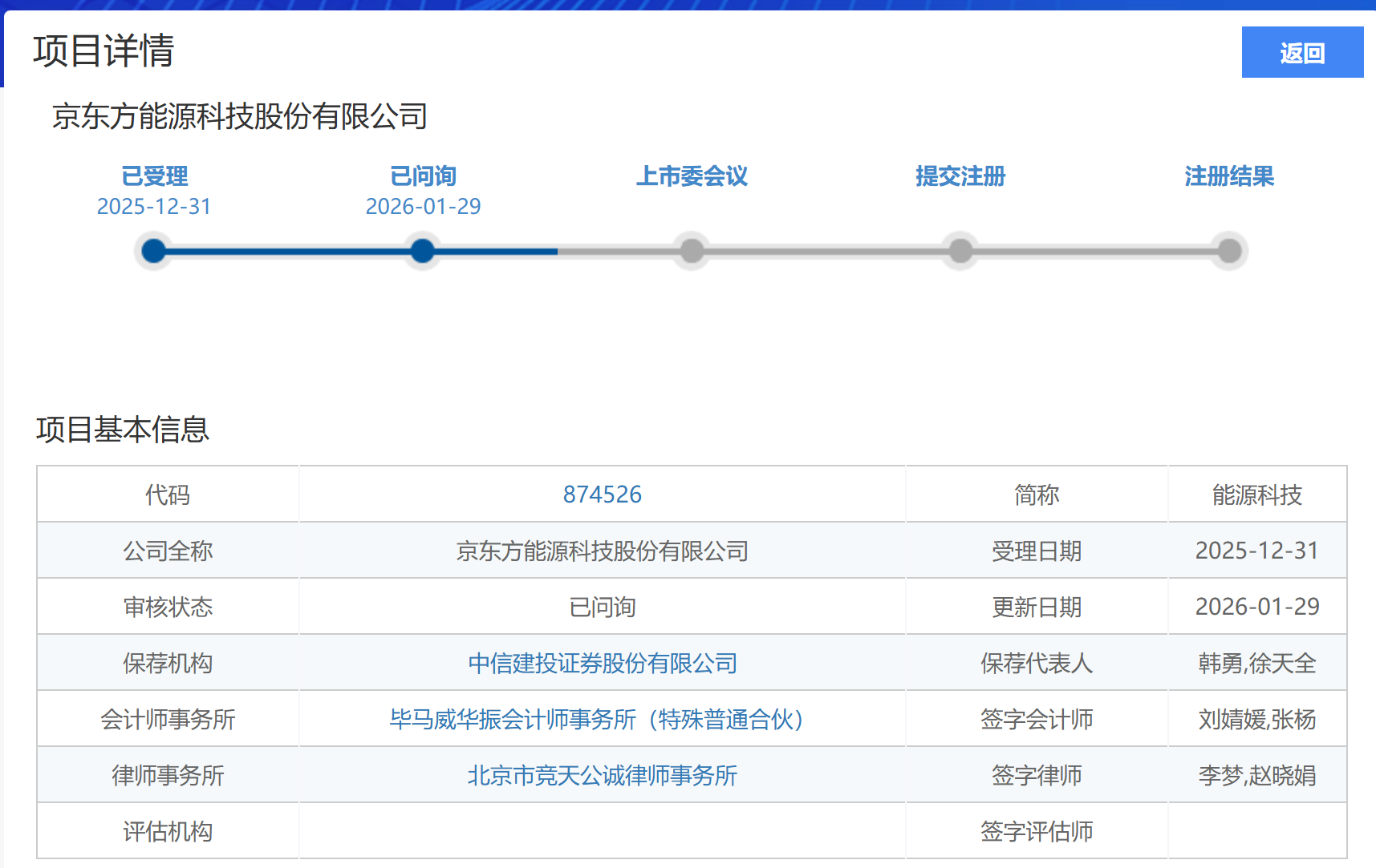 上证报中国证券网讯 1月29日,京东方能源科技披露公告,公司收到北交所上市审核问询函,公司及保荐机构中信建投需在20个工作日内完成回复。