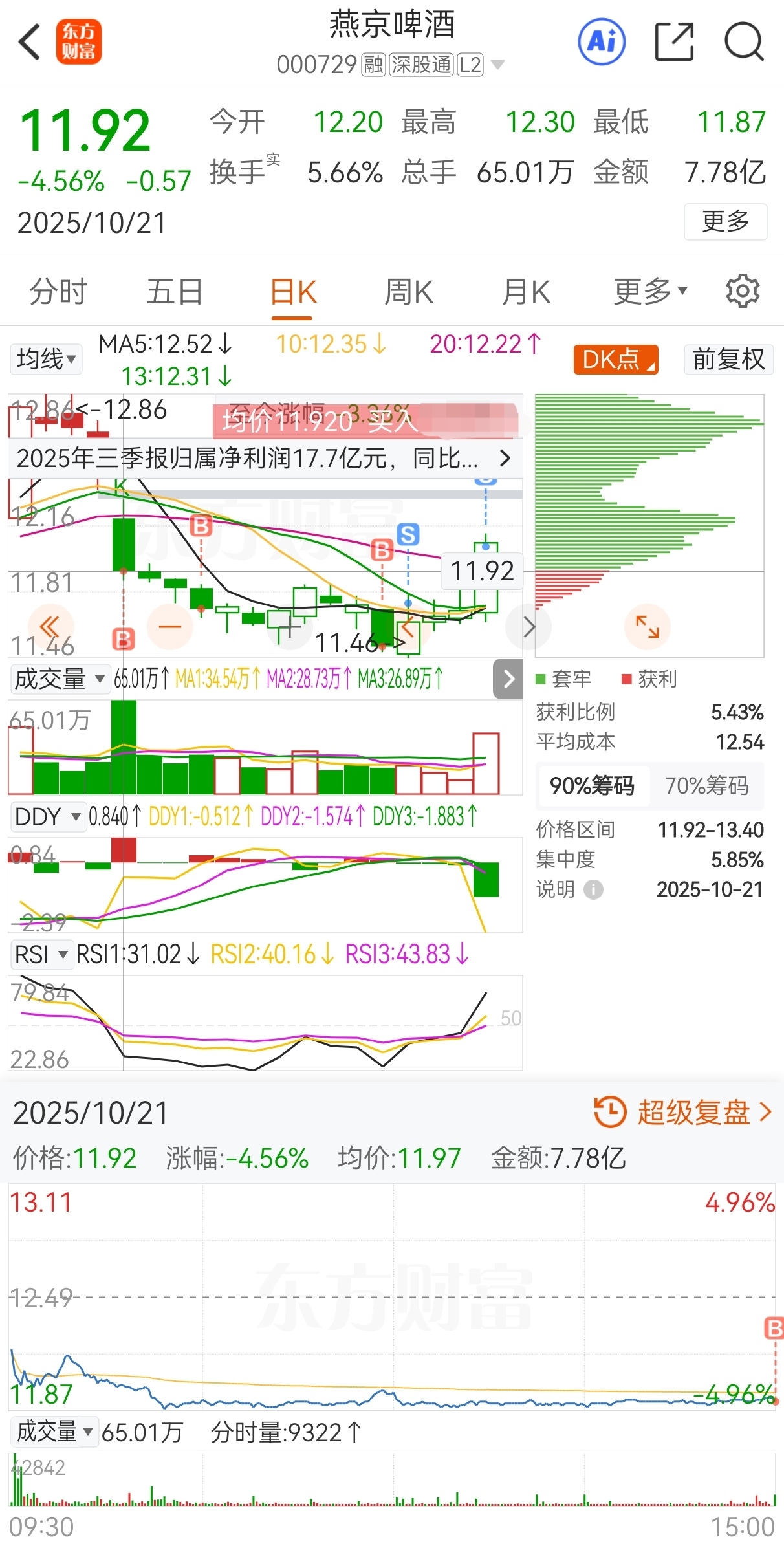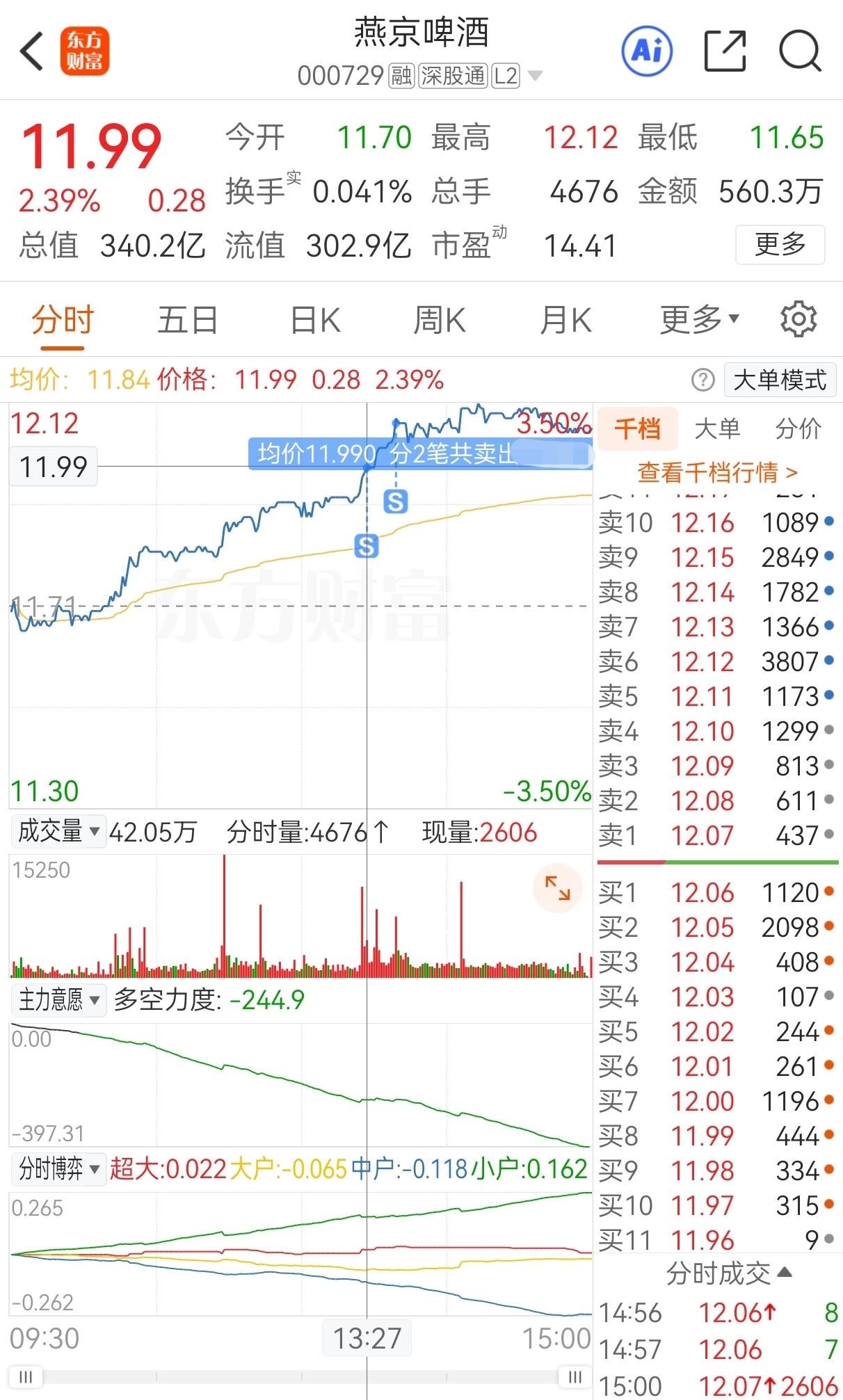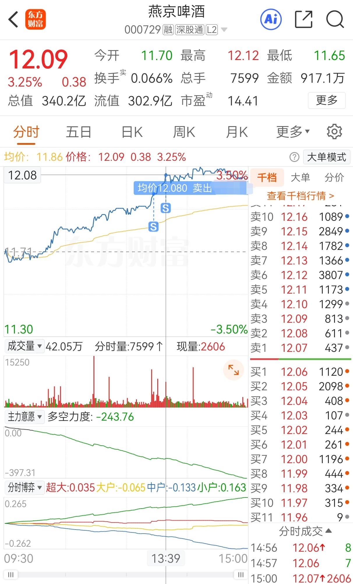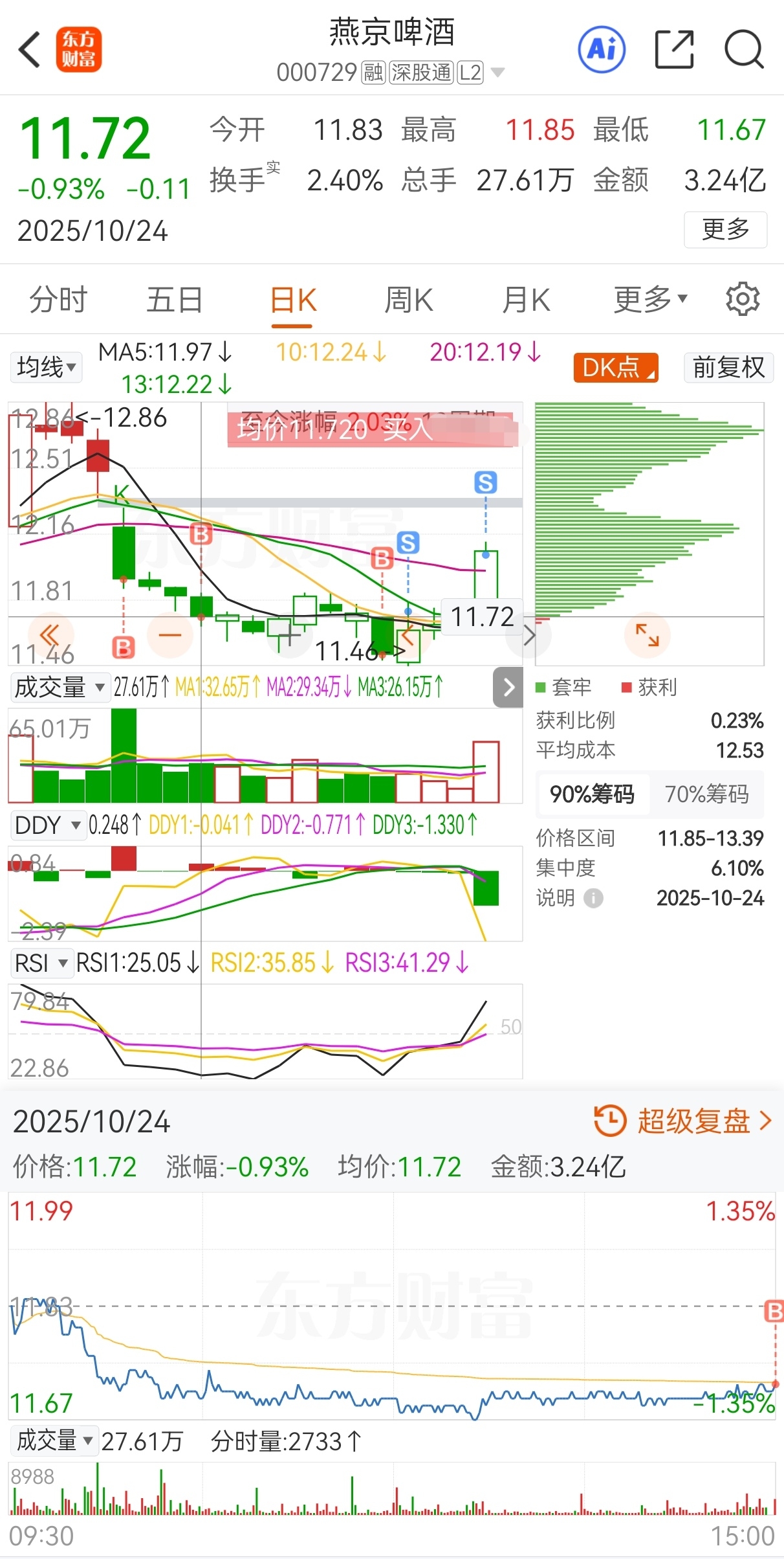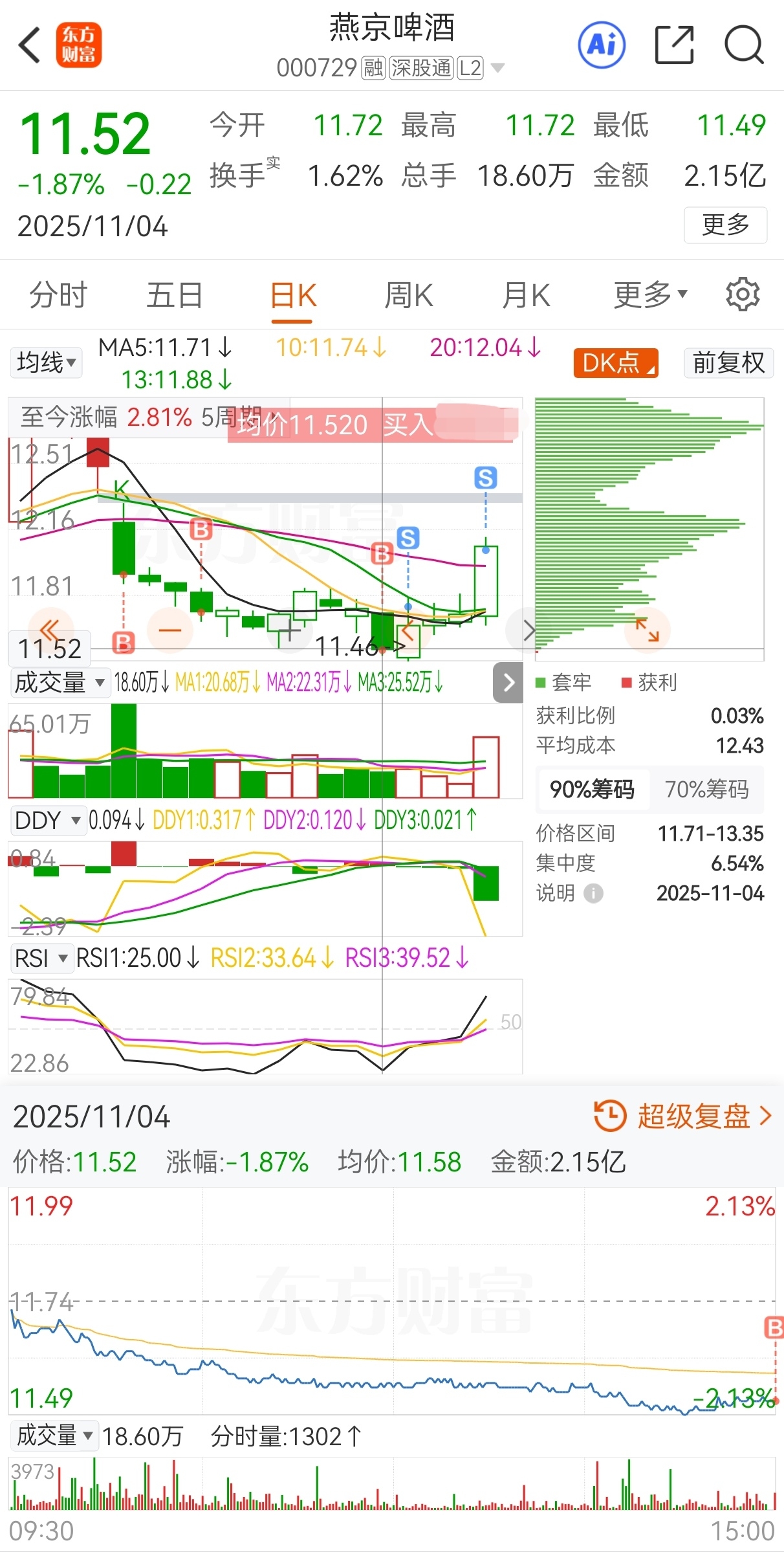 $燕京啤酒(SZ000729)$ 原计划今买明卖,实际11.92买,11.72加仓,11.52再加仓,11.75减仓,11.99继续减仓,12.08卖,实盘短线套利燕京啤酒,成功收米走人!