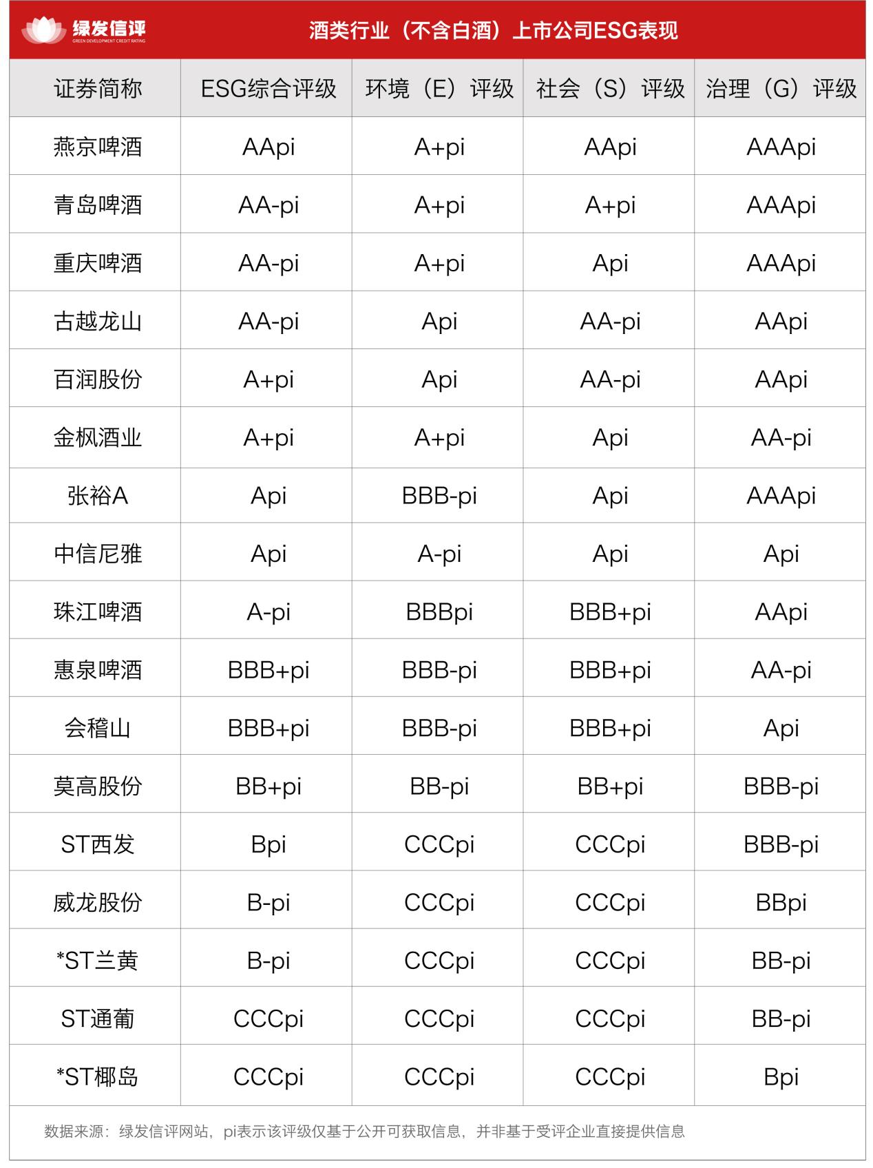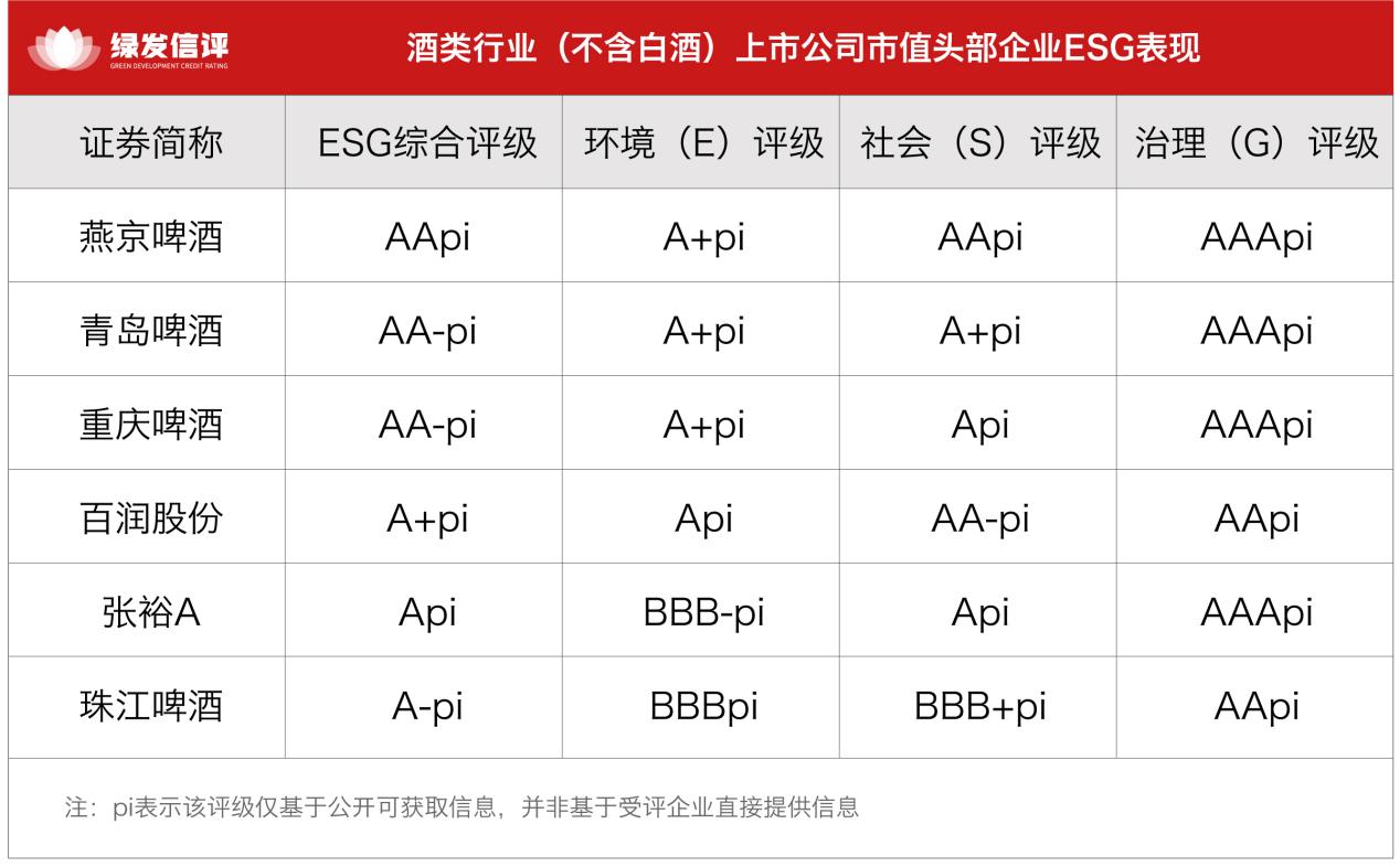 中国财富网讯近日,海南绿色发展信用评级有限公司(以下简称“绿发信评”)在其网站发布A股上市公司ESG主动评级结果。评级结果显示,市值处于头部的6家酒企(不含白酒)中,燕京啤酒获得AApi评级;青岛啤酒和重庆啤酒获得AA-pi评级;百润股份获得A+pi评级;张裕A获得Api评级;珠江啤酒获得A-pi评级。