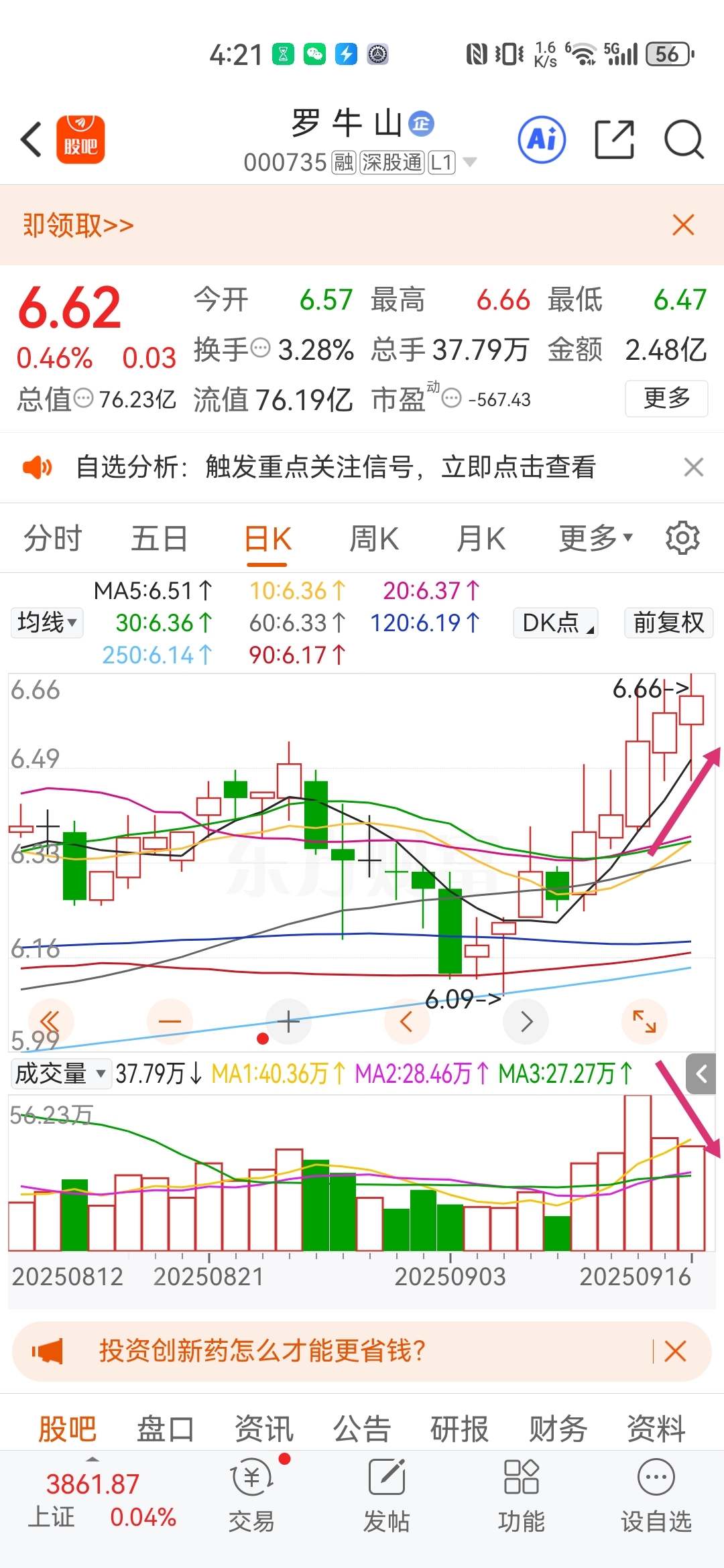 连续三日试盘6.64、6.65、6.66。价升量缩,典型的喇叭口黄金柱,看好明天