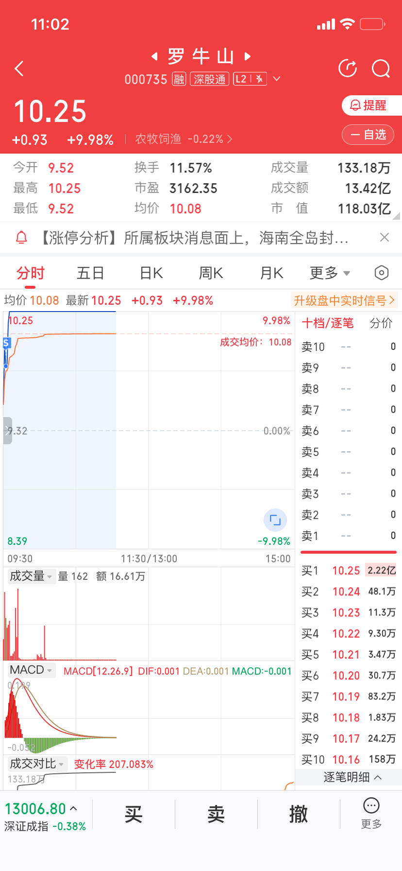 $罗 牛 山(SZ000735)$ 看盘容易出错。迟一分钟我也不会卖