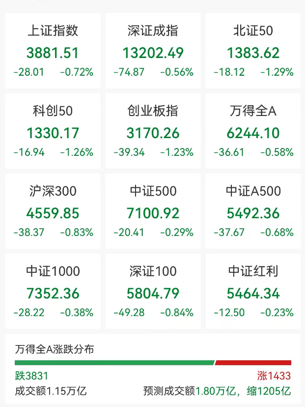 12月10日,A股市场震荡调整,截至午盘收盘,沪指跌0.72%,深成指跌0.56%,创业板指跌1.23%,量能再度萎缩,沪深两市半日成交额1.15万亿,较上个交易日缩量1205亿。全市场超3800只个股下跌。