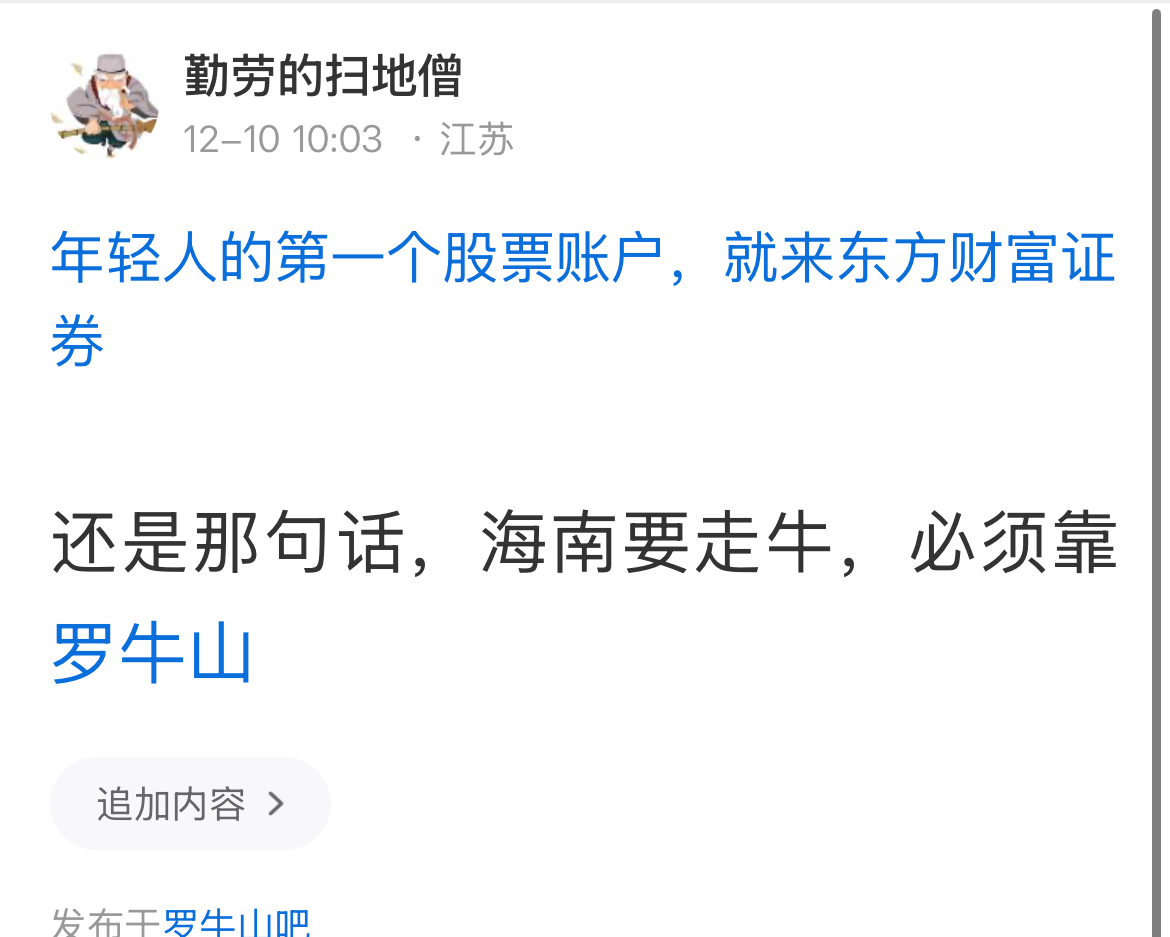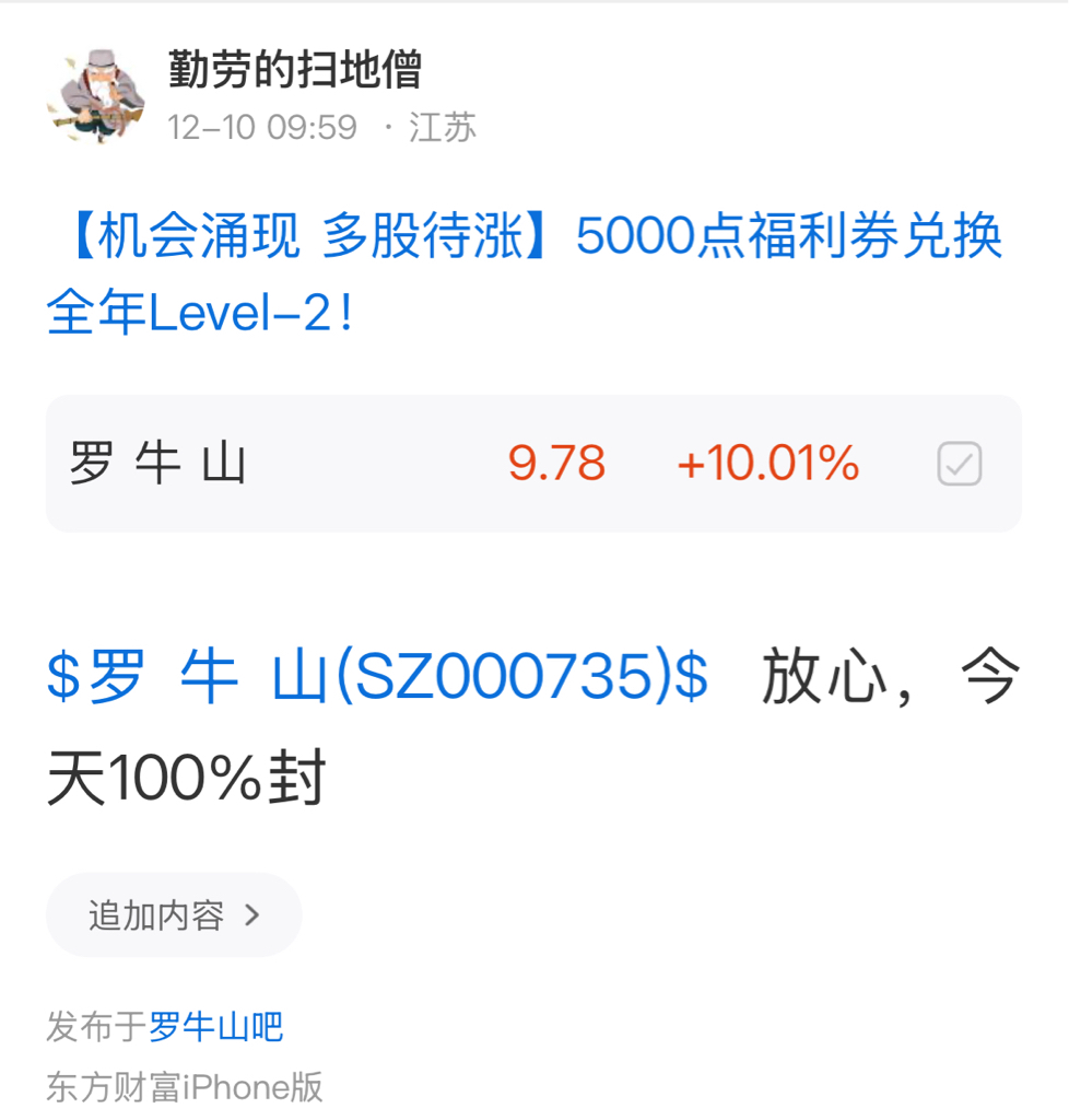 $罗 牛 山(SZ000735)$ 12月份买入罗牛后,前几天一直盯着看盘,今天上午没太多时间盯着,只是简单看了一下盘面,罗牛山涨停打开后,本人9:59预测一定会回封,10:03分再次强调原来观点:海南要走牛,必须靠罗牛山。果然,10:12分罗牛山回封涨停,且带动了整个海南板块。本人发表言论只做预测,从来不搞马后炮。