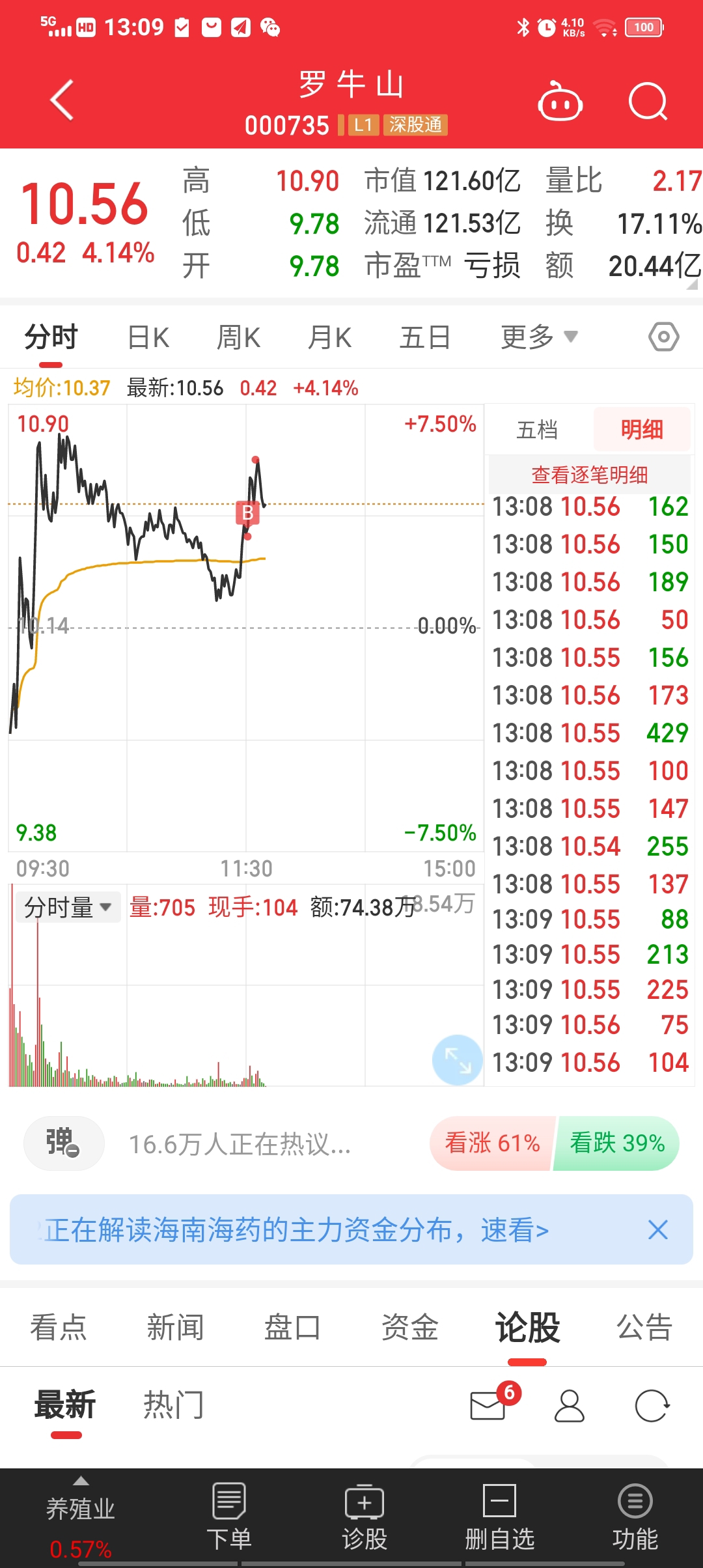 $罗 牛 山(SZ000735)$ 很好,一追就是最高点,跌到10.2没钱买,卖了指南针买的
