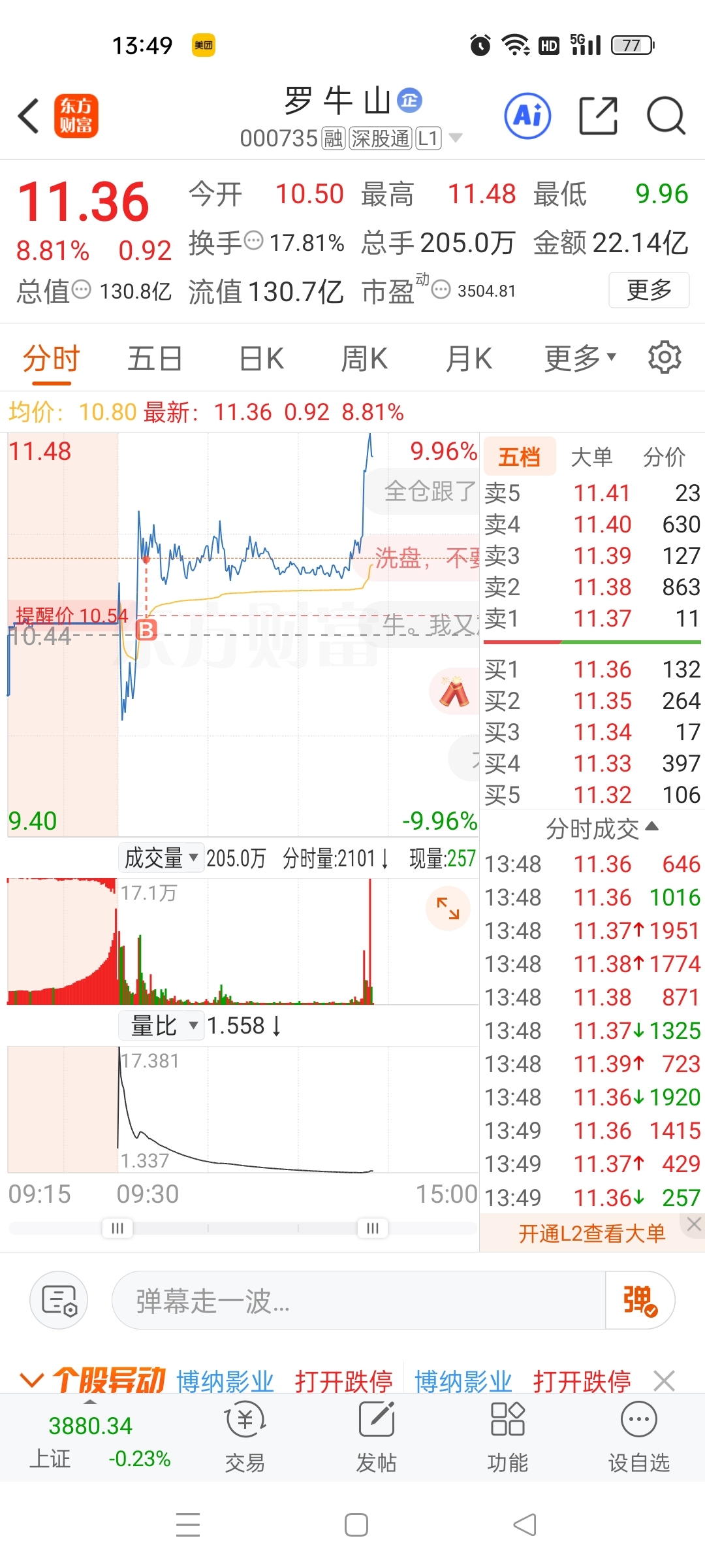 $罗 牛 山(SZ000735)$ 周五罗牛山,博纳影业二选一,买博纳涨停今天被按地板,今天又来买罗牛山,总是节奏差一点点