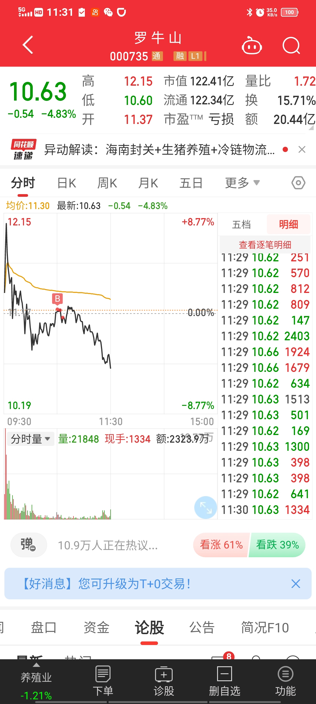 $罗 牛 山(SZ000735)$ 早上开盘要卖了罗牛山,买西测就好了,水下8个点,吃20cm没问题。结果高点没出还加仓了罗牛山