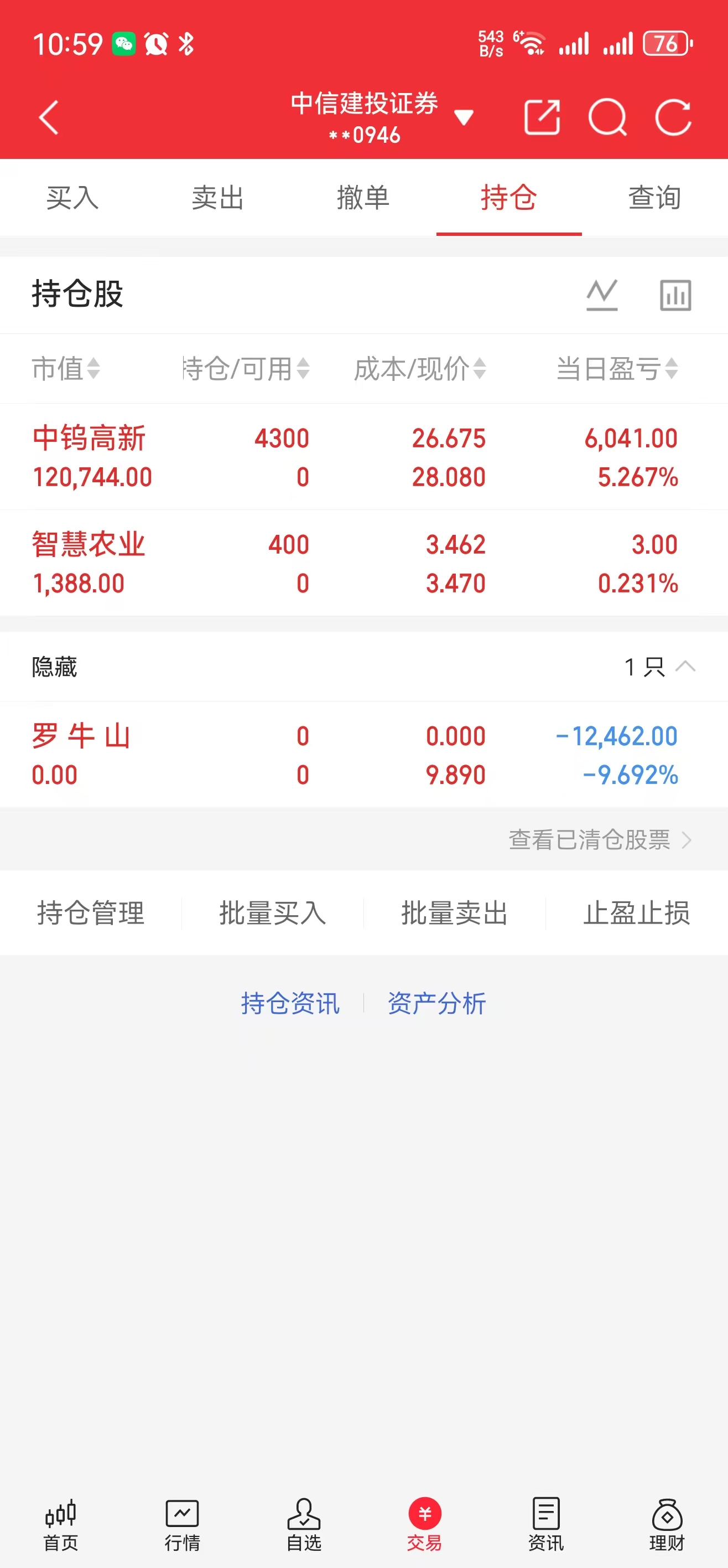 今天不该格局的 明明知道昨晚那么发利好,没有高开就是走弱了 还抱着侥幸的心里 到地板才走,在罗牛呆了一星期 最高赚15个点,格局到只赚一个点走了 ,哎。。心痛 还好去了中钨高新回一口 不然今天满仓跌停 太痛了