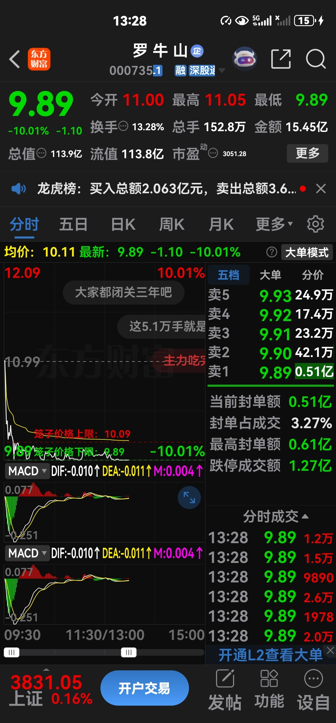 $罗 牛 山(SZ000735)$ (9.89元)跌停买了100万